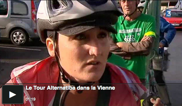 En quittant le lycée Kyoto ce matin, nous avons la visite de France 3 Poitou-Charentes. Alors que les cyclistes règlent les selles et remplissent leurs gourdes, les journalistes approchent et les interrogent : "qu'entendez-vous par faire la vélorution ?". Les échanges vont bon train, les images seront diffusées tout au long de la journée dans différents programmes d'information. Quand midi sonnera, clou du spectacle, Coline, notre cycliste bordelaise, sera interviewée en direct sur le plateau du journal !