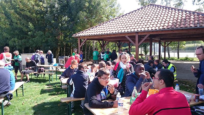 Aujourd'hui nous partageons la pause déjeuner avec professeurs, éducateurs et surtout un bon nombre d'élèves de l'Institut médico-éducatif (IME) de Châtelrault... 16 d'entre eux pédalerons avec nous tout au long de l'étape de l'après midi ! Hugo, éducateur technique spécialisé à l'origine de cette rencontre, nous explique ses motivations : pour permettre aux enfants de gagner en autonomie, les faire sortir du cadre habituel de l'IME est une super opportunité. Échanger avec eux autours des enjeux climatiques a été un des axes de travail d'Hugo au sein de l'IME en ce début d'année scolaire. Le passage à la pratique cet après midi est un moment privilégié pour concrétiser ces discussions, d'autant plus que les jeunes affectionnent particulièrement les sorties en plein air. Ils se sont d'ailleurs montrés à la fois respectueux des consignes de sécurité (nous empruntions des routes fréquentées par les automobilistes) et très responsables dans la gestion de leur effort physique. Théo et Rémi se sont prêtés au jeu avec tellement de sérieux et surtout de plaisir qu'ils ont effectué les derniers kilomètres, au cours de la vélorution, sur les tandems ! Il fallait voir les sourires se dessiner sur leurs visages, un vrai bonheur !