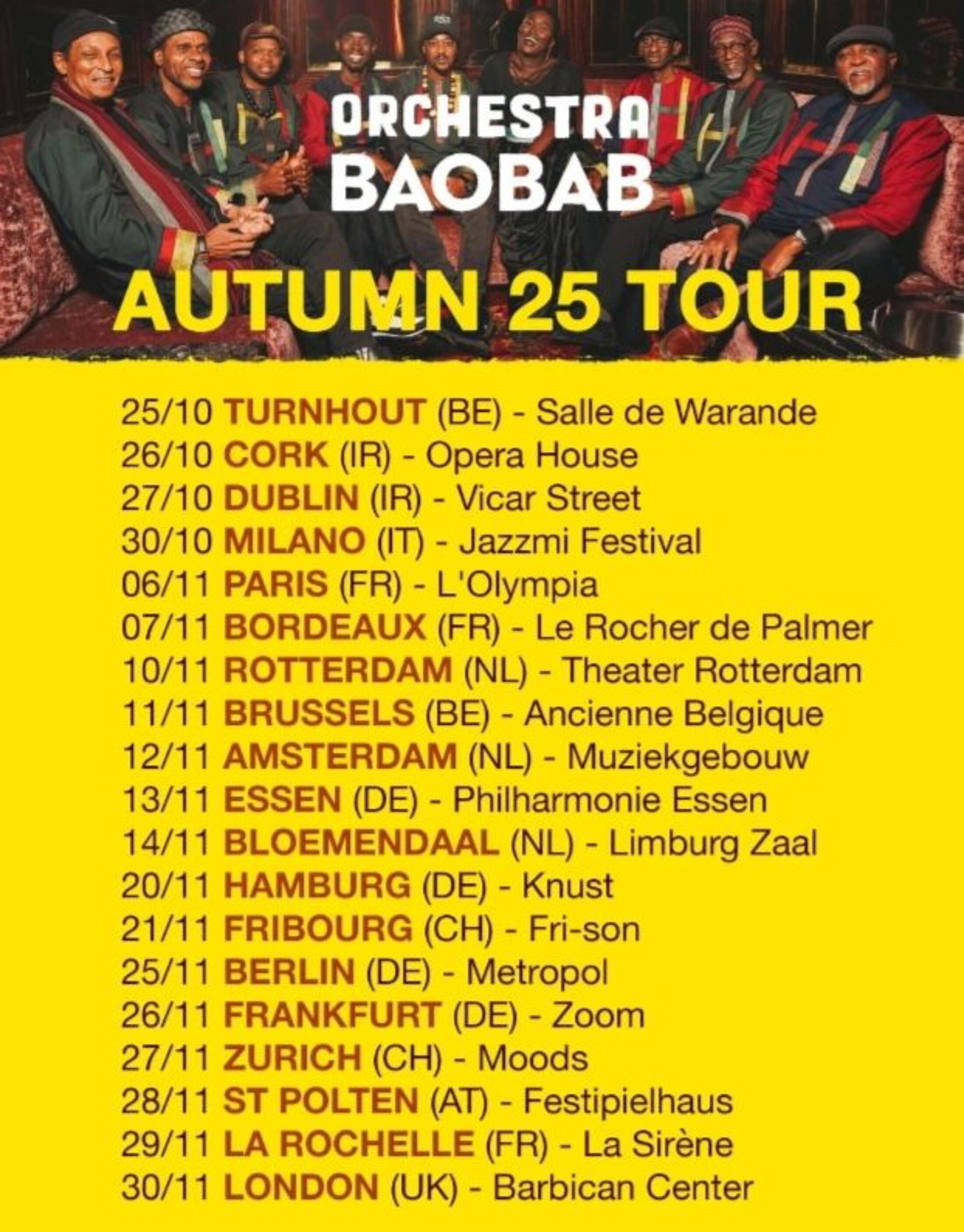 L'Orchestra Baobab, un groupe mythique du Sénégal, est en tournée européenne, et fera un concert le 6 novembre 2025 à l'Olympia là où la chanteuse égyptienne Oum KALSOUM avait fait un tabac dans les années 60.