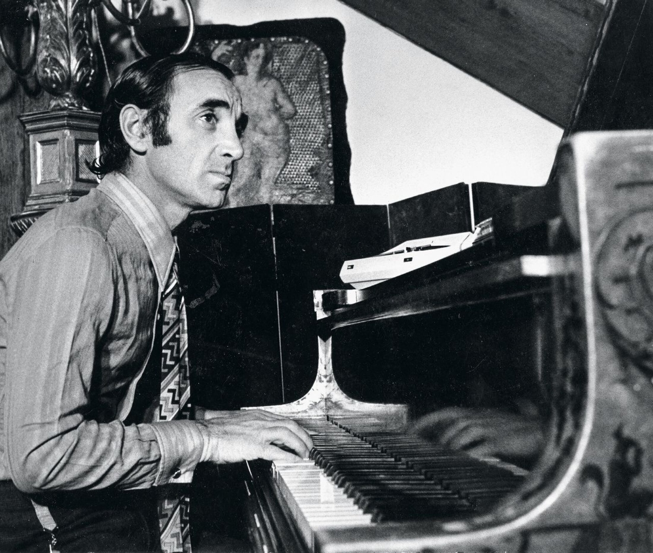 En 1952, AZNAVOUR rentre en France et commence à chanter en solo, sans succès immédiat. En revanche, il se fait vite un nom comme parolier et compositeur pour plusieurs artistes féminines célèbres. Le 2 décembre 1958, AZNAVOUR est la vedette à l’Olympia, d’un «Musicorama» retransmis en direct sur Europe 1. Le 12 décembre 1960, il chante à L’Alhambra, à Paris, notamment «Je me voyais déjà», et le triomphe arrive enfin. «Il n’y a pas de grandes ou petites chansons, il y a la chanson, un point, c’est tout. Celle que vous aimez, celle qui chante à vos cœurs et à vos mémoires, qui est et restera celle qui rend la vie meilleure, ou plus douce ou plus belle» dit AZNAVOUR. Dès lors, adopté par le public français, il enchaîne les tournées dans le monde avec un succès sans cesse grandissant, avec des titres comme : Il faut savoir, Et pourtant, La Bohème, La Mamma, For Me Formidable, Comme ils disent, Que c’est triste Venise. Partout, il devient un incontournable de la chanson française. Avant d’arriver à cette consécration, il en a bavé, comme on le dit, familièrement «on m’a hué, envoyé des sous, des canettes de bière, mais j’ai tenu et je suis là». Finalement, il restera en haut de l’affiche, pendant plus de 84 ans.