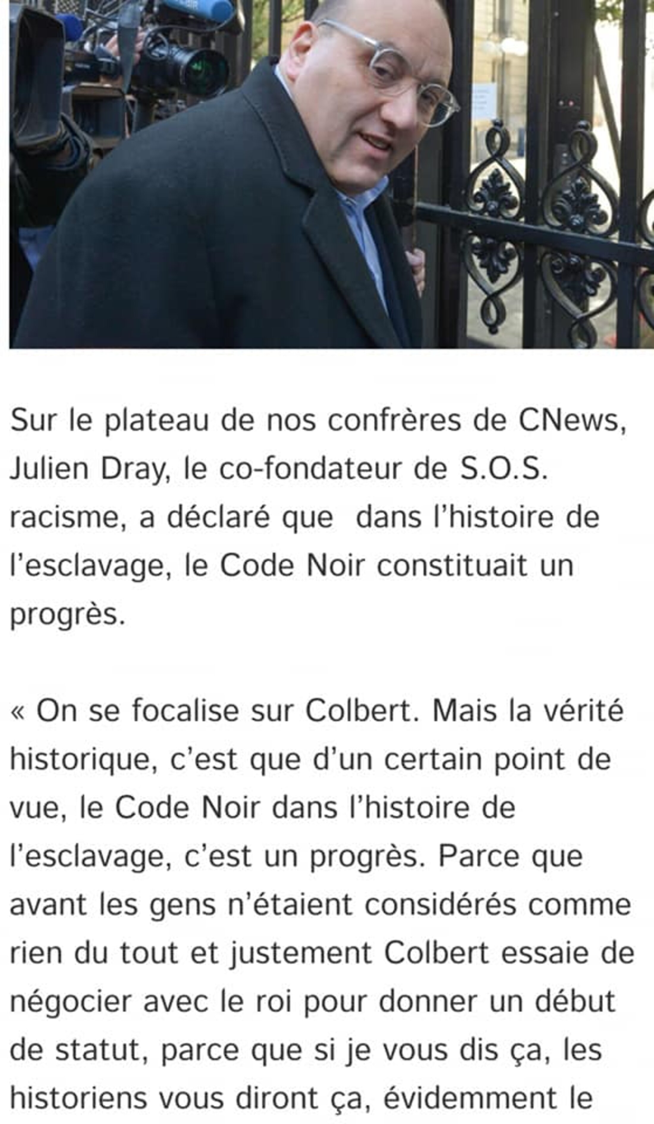 Je suis horrifié et scandalisé qu'un tenant de la Gauche du Parti socialiste, membre du conseil régional, et surtout l'un des fondateurs de SOS RACISME, puisse venir nous expliquer que le Code noir était un progrès social : «On se focalise sur Colbert. Mais la vérité historique, le Code noir dans l’histoire de l’esclavage, c’est un progrès. Parce que les gens n’étaient pas considérés comme rien du tout, et justement, Colbert essaie de négocier avec le Roi, pour donner un début de statut» déclare Julien DRAY, chez CNews, la chaîne d’Eric ZEMMOUR ; ceux-là même qui bavent sur nous, chaque soir, sans que SOS-RACISME ne s’en offusque.