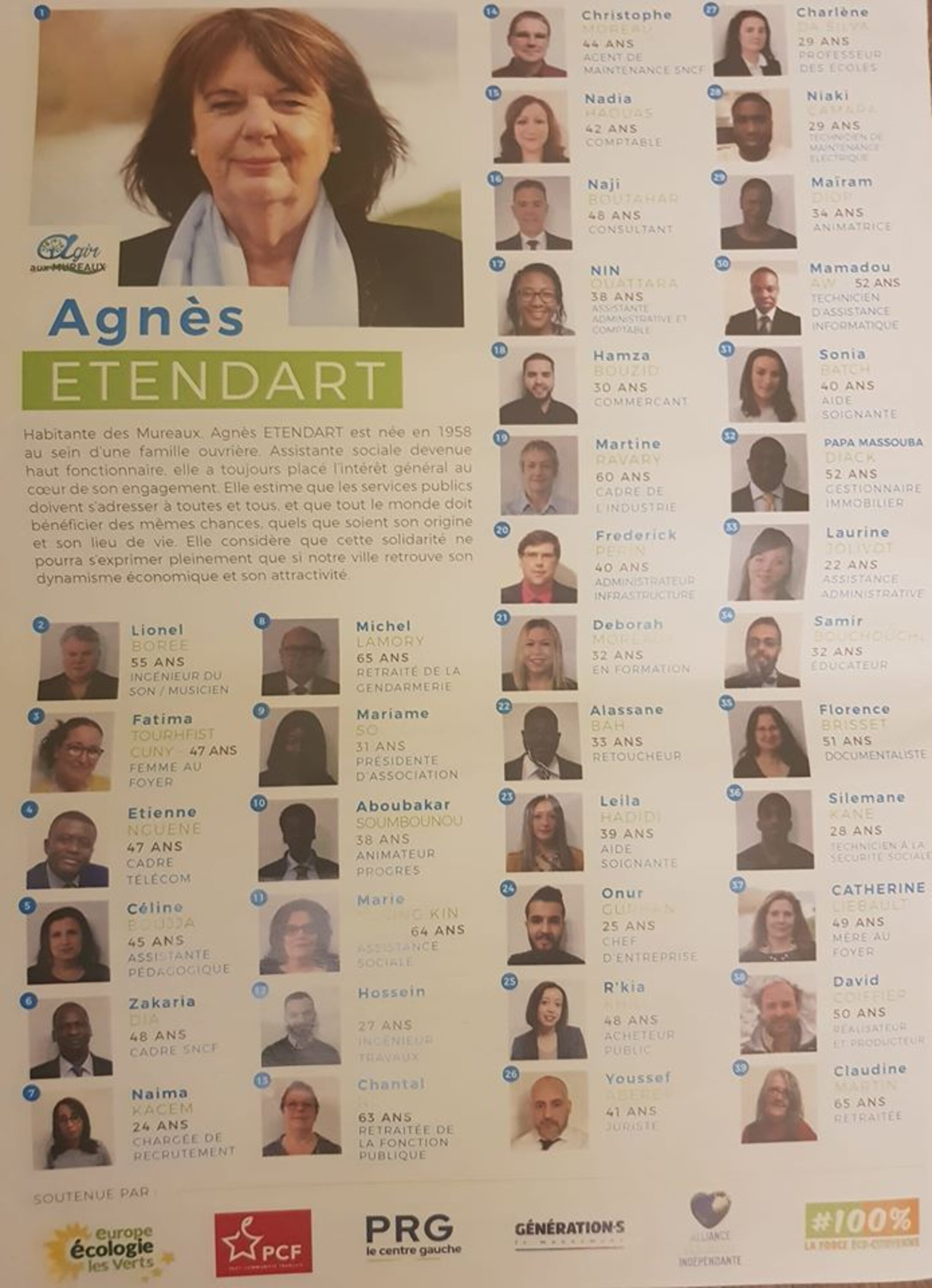Mme Agnès ETENDART, avec «Agir aux Mureaux», a présenté sa liste le vendredi 28 février 2020. C’est une liste qui ressemble et rassemble tous les Muriautins, les quartiers et la diversité ethnique, professionnelle et des âges y étant représentés de façon équilibrée et équitable. Sur les 39 candidats, 21 sont issus des quartiers. La jeunesse, au cœur de cette campagne électorale, y a pris toute sa place (15 candidats de moins 41 ans).