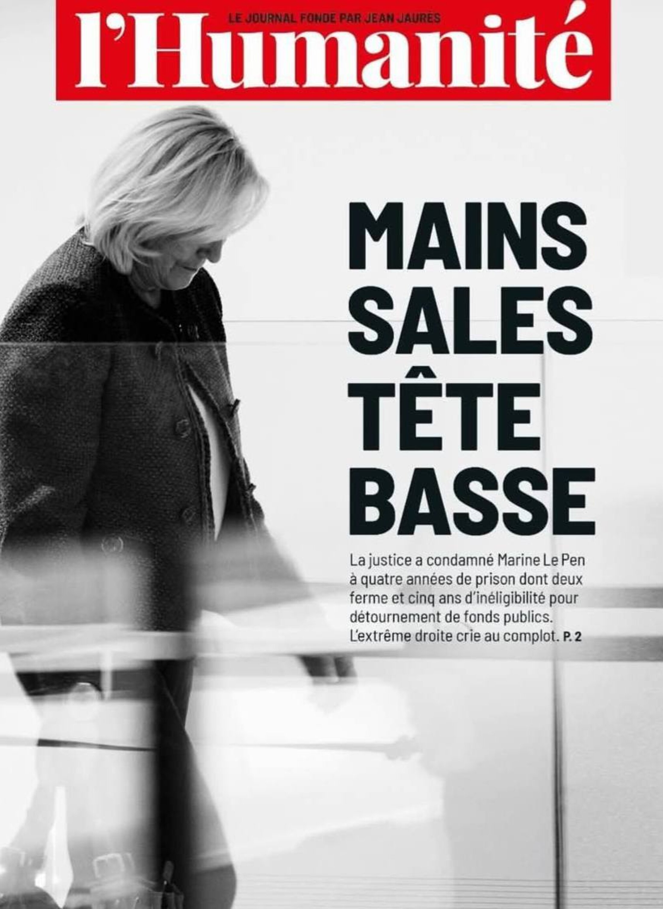 Le R.N. fustige, sans arrêt, la délinquance à la fois des racisés et de la classe politique, et surtout un prétendu laxisme de la justice, n’a cessé de réclamer des peines exemplaires, plus sévères, des peines planchers ou exécutoires, même pour les mineurs. En particulier, dans la posture d’antisystème, revendiquant, exclusivement, au sein de la classe politique l’honnêteté, la droiture et l’intégrité, la «tête haute et les mains propres» disait Jean-Marie LE PEN (Voir mon article, Médiapart, 7 janvier 2025), Marine LE PEN, devenue maintenant une délinquante, a les «mains sales, la tête basse», en référence du titre de la une du journal l’Humanité. En effet, Marine LE PEN se vantait, jusqu’ici, d’être la cheffe du «seul parti honnête» et de porter une «veste immaculée ; ce qui n'est pas le cas des autres» qui n’a jamais été éclaboussée par les affaires, avait-elle dit le 3 avril 2013, à Charleville-Mézières, dans les Ardennes. Or, dans ce procès des assistants parlementaires, l’image du R.N est sérieusement écornée. En effet, la petite entreprise avait vendu l'image de la haute probité et dans ses calomnies relayées par la presse des forces du Chaos, notamment de Vincent BOLLORÉ, que les racisés seraient tous, sans distinction, des délinquants potentiels et des fraudeurs aux avantages sociaux.