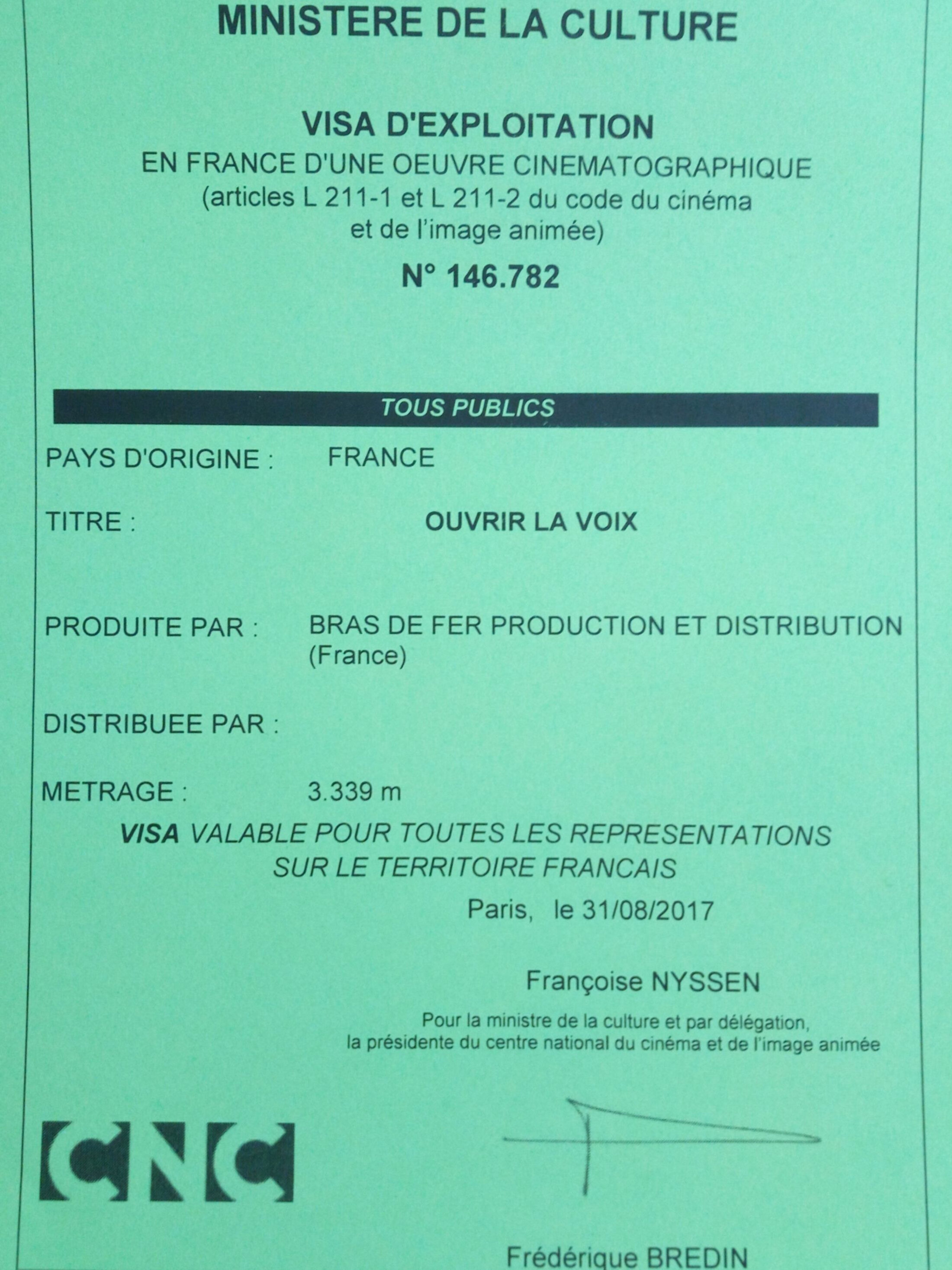 2) Le St-Graal, j'ai nommé le visa d'exploitation est enfin arrivé à la maison et je dois avouer qu'après 4 ans de hauts et de bas, ce morceau de papier constitue la preuve tangible de ce pourquoi j'ai tant travaillé. C'est bon parfois d'avoir un objet, même si c'est juste un papier, qui symbolise les rares bras de fer avec l'institution qu'on a remporté. Maintenant, je pourrai me dire, j'ai fais ça. J'ai mené un film de mon esprit aux écrans de cinéma. Et la sortie nationale en France n'est que le début, la Suisse, la Belgique et le Canada suivront sous peu. Et l'Angleterre et l' Allemagne auront aussi leurs tournées de projections-débats à défaut de sortie nationale. Quoiqu'il arrive, c'est un accomplissement qu'on ne m'enlèvera pas. Je suis fière et ma joie n'a d'égale que ma fatigue, c'est vous dire qu'elle est immense.