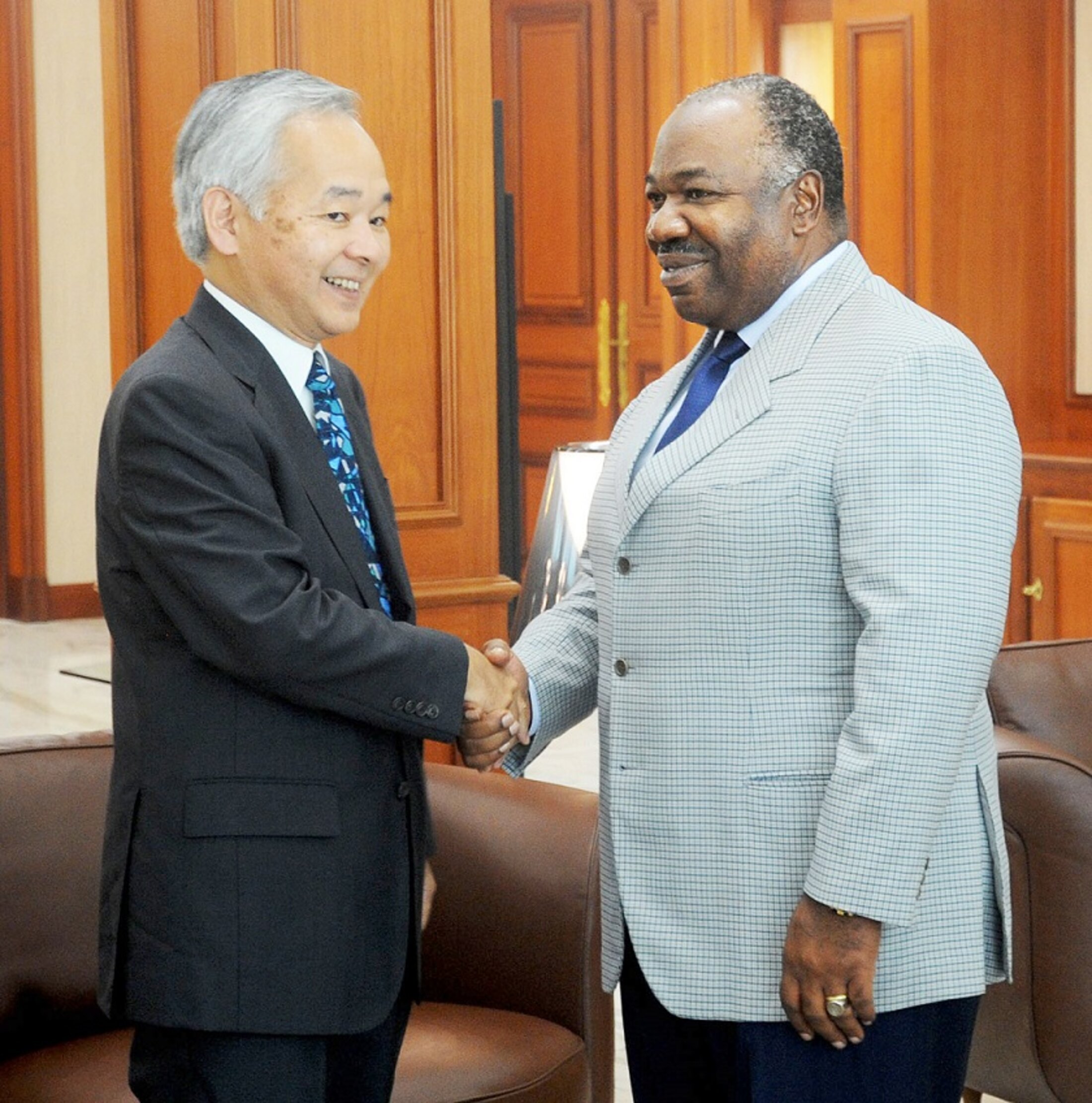 Poignée-de-mains-entre le chef-de-l’Etat Gabonais, Ali BONGO ONDIMBA et S.E.M. Yoshifumi OKAMURA