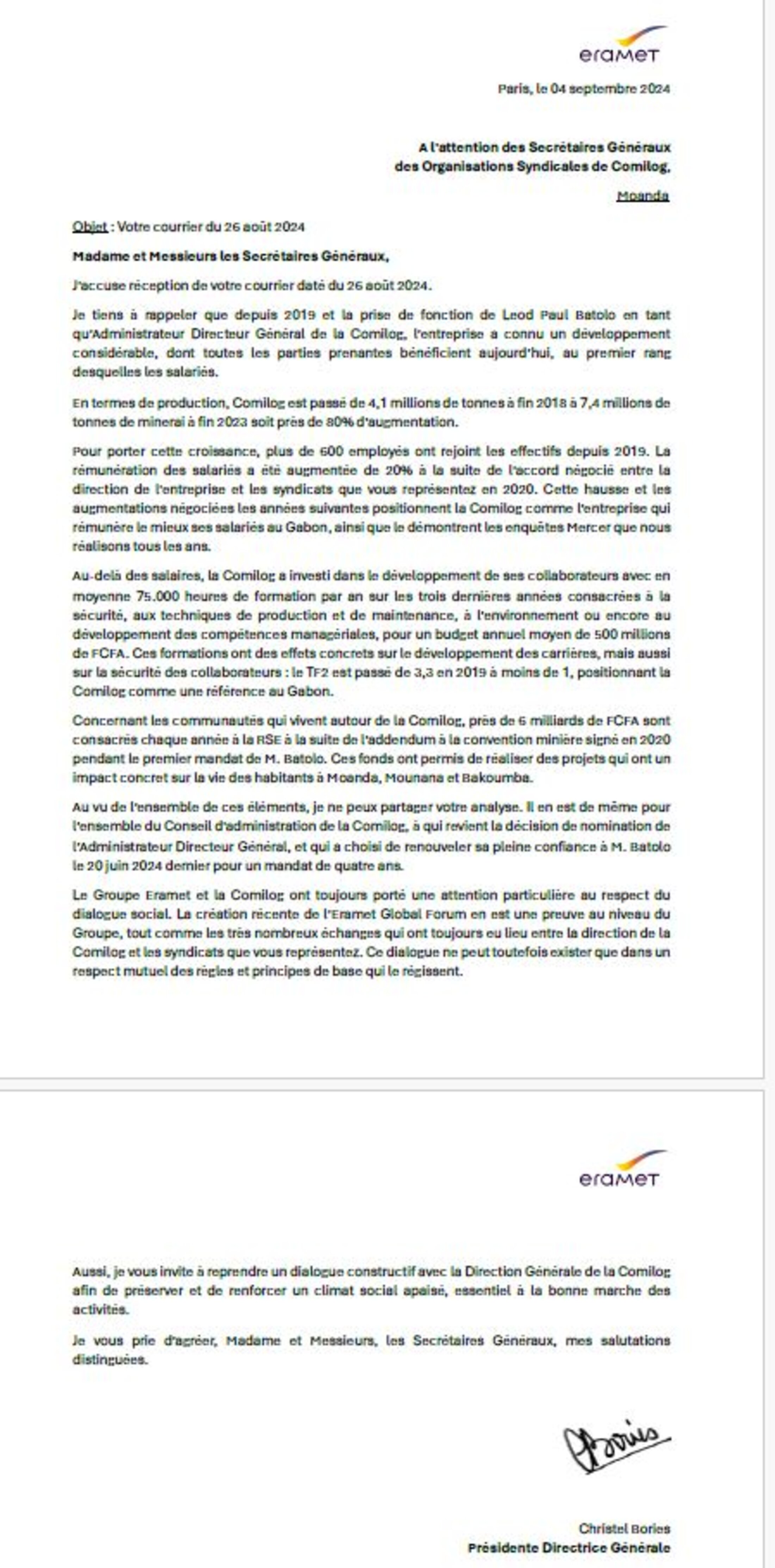 Le 4 septembre 2024, Christel Bories a adressé une réponse aux syndicats de Comilog qui restera dans les annales du paternalisme d'entreprise. Cette missive, suintant la condescendance, est un monument d'hypocrisie et de mépris envers les travailleurs gabonais. S'appuyant sur des chiffres de production en hausse et des investissements qui apparaissent dérisoires au regard des bénéfices engrangés, elle a balayé d'un revers de main les revendications légitimes des employés. Son refrain "je ne peux partager votre analyse" résonne comme un "NIET" stalinien, digne des plus sombres heures du capitalisme sauvage. On croirait entendre les échos des patrons de mines décrits par Émile Zola dans "Germinal", sourds à la misère qu'ils engendrent, aveuglés par leur cupidité.