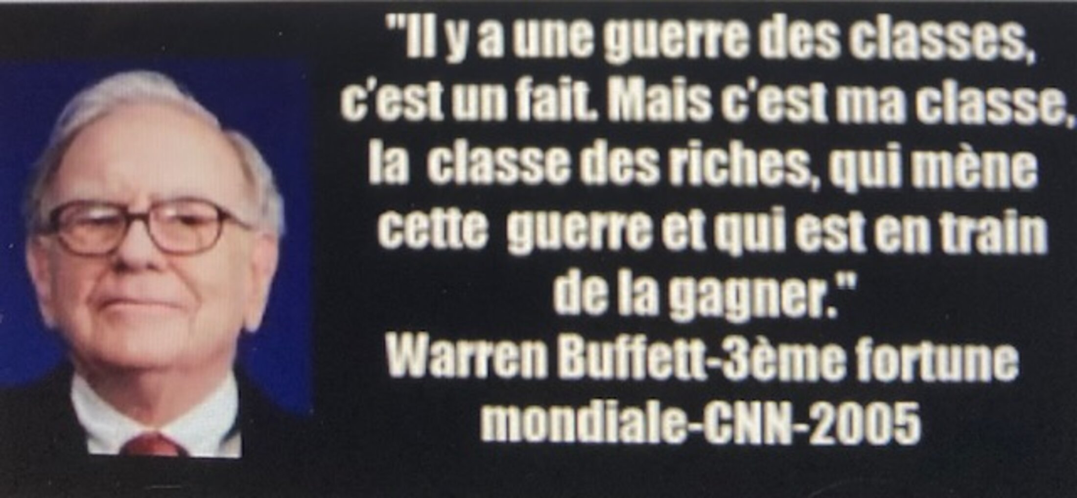 Warren Buffet disait la vérité il y a 20 ans sur le classisme (note 1) comme lourde domination de classe et même dit-il sans euphémisme "guerre de classe" : ce n’est pas peu dire que pour cet oligarque la guerre n’est pas que militaire. Il n'y a pas que les canons qui font souffrir, qui blessent, qui tuent ! Et cette guerre économique ne porte pas que contre les plus pauvres mais aussi beaucoup plus largement contre le monde du travail salarié subordonné (MTSS) des 99% et pas seulement au travail-emploi, en dehors aussi, notamment contre les services publics avec privatisations, marchandisations et financiarisations.