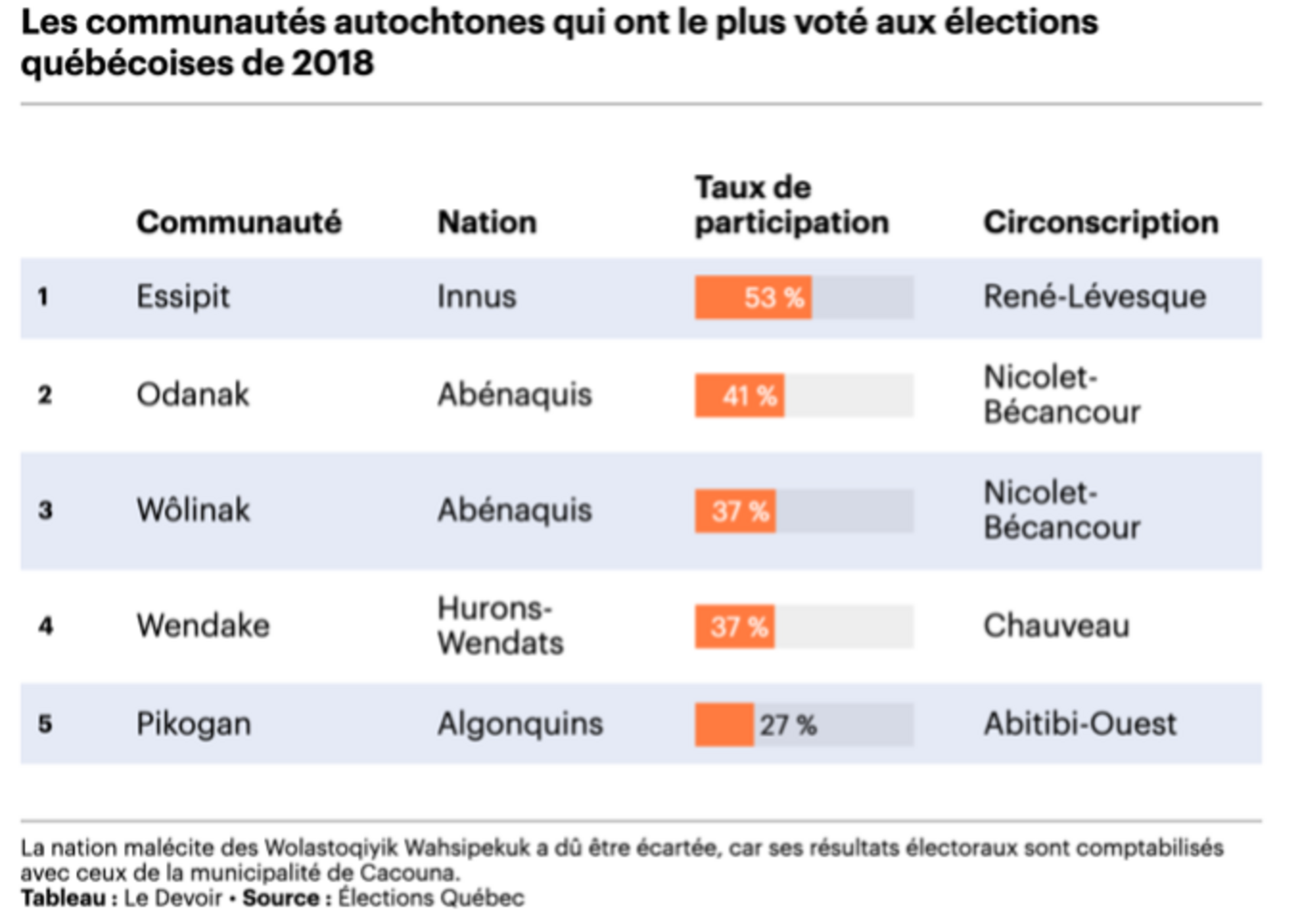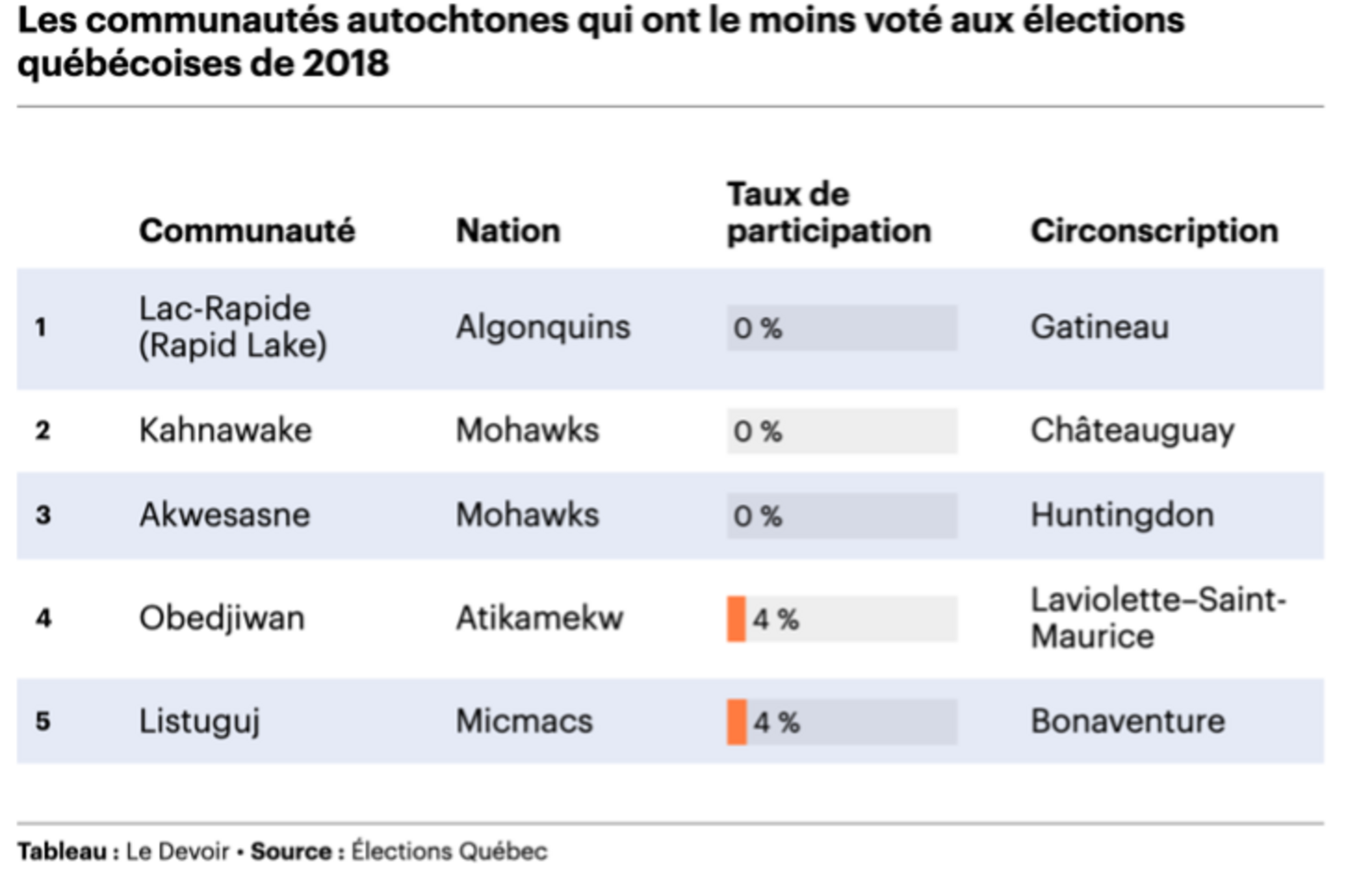 [18] Gionet, S. V., Simon. (2022, septembre 10). Pourquoi les communautés autochtones votent-elles peu aux élections provinciales? Le Devoir. https://www.ledevoir.com/politique/quebec/753528/elections-quebec-2022-pourquoi-les-communautes-autochtones-votent-elles-peu-aux-elections-provinciales