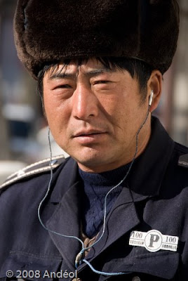 Et puis biensûre la fameuse toque pour ceux qui travaillent dehors. Responsable du parking dans l'impasse derrière MeiShuGuan, il a voulu "tomber" son manteau pour "révéler" son uniforme ! Sa fierté chapeauté se lit dans le regard bridé et concentré !