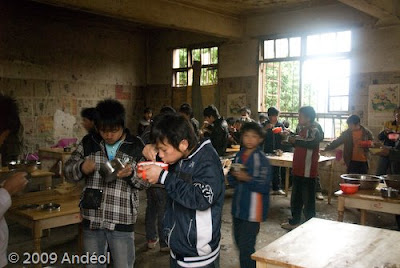 Nous avons déjeuné avec les professeurs. Il s'agit de trinquer avec l'alcool de riz local ! Là, les mœurs sont bien chinoises et Andéol, le seul homme, doit trouver des feintes pour être sûr de pouvoir redescendre la montagne. De mon côté, je garde l'alcool en bouche et la panne de courant me permet de cracher discrètement dans un coin ... ouf ! Il y a près de 10 enseignants autour de la table qui veulent tous nous faire l'honneur de boire avec nous, d'échanger nos verres d'alcool. La solution c'est sourire sourire ! et ce n'est pas difficile ils sont tellement adorables!