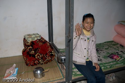 La rencontre avec nos filleules et leur famille est un moment unique. Wei Xiuzhong est en dernière année de primaire. Elle vit avec sa grand mère et son oncle. Ses parents son partis à l'usine loin, avec sa petite sœur. Son grand frère est au collège, pensionnaire. Elle avait toujours, à la main, une petite fille. "C'est ma sœur" me dit-elle. Mais en fait c'est sa cousine. Elle devrait donc continuer l'année prochaine et rejoindre son frère.