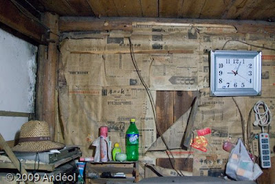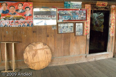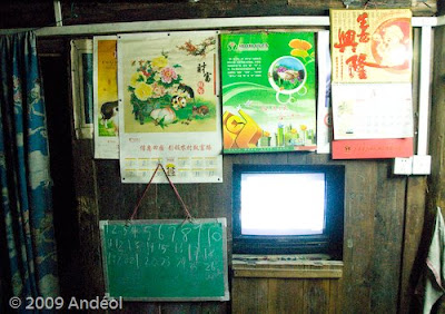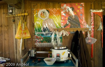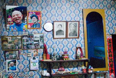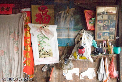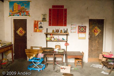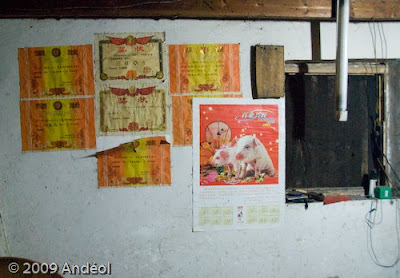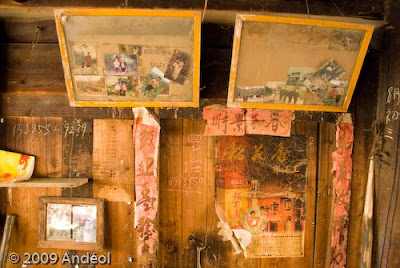 Bien souvent il fait sombre, et ça part dans tous les sens ... photos d'ancêtres, affiches de stars de la publicité jeunes et jolies, un vieux calendrier de l'année du cochon, des photos de famille (on se demande vraiment comment elles sont arrivées là, collées depuis déjà quelques temps, jaunies et cornées mais si précieuses !) et bien entendu le portrait de Mao...
