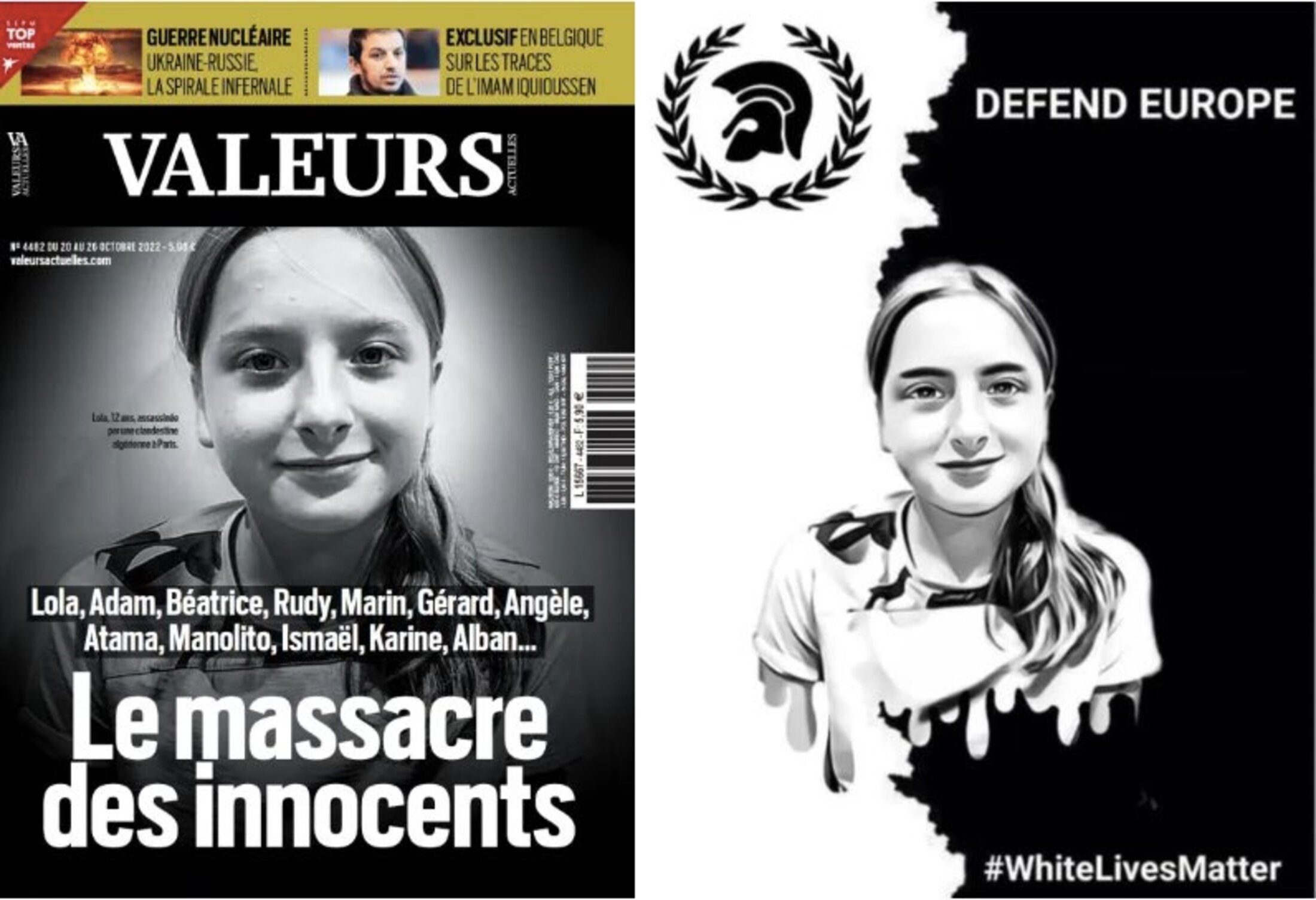 Cette lecture qui rencontre un large écho dans la mouvance suprémaciste est relayée par des médias comme CNews ou Valeurs actuelles, qui choisit d’afficher en couverture le visage de Lola. On notera que la récupération ne se limite pas à une interprétation opportuniste du crime. Par l’exploitation publique des images ou l’achat de noms de domaine composés à partir du prénom Lola, c’est la méthode de l’agit-prop, caractéristique de la gauche radicale et des mouvements citoyens, qui est copiée avec application par la galaxie zemmouriste. La lecture racialiste des traits de la petite fille agit comme une reprise en miroir de l’exposition du meurtre de George Floyd, où l’antagonisme du policier blanc et de la victime noire incarnent dans l’image la discrimination raciste.