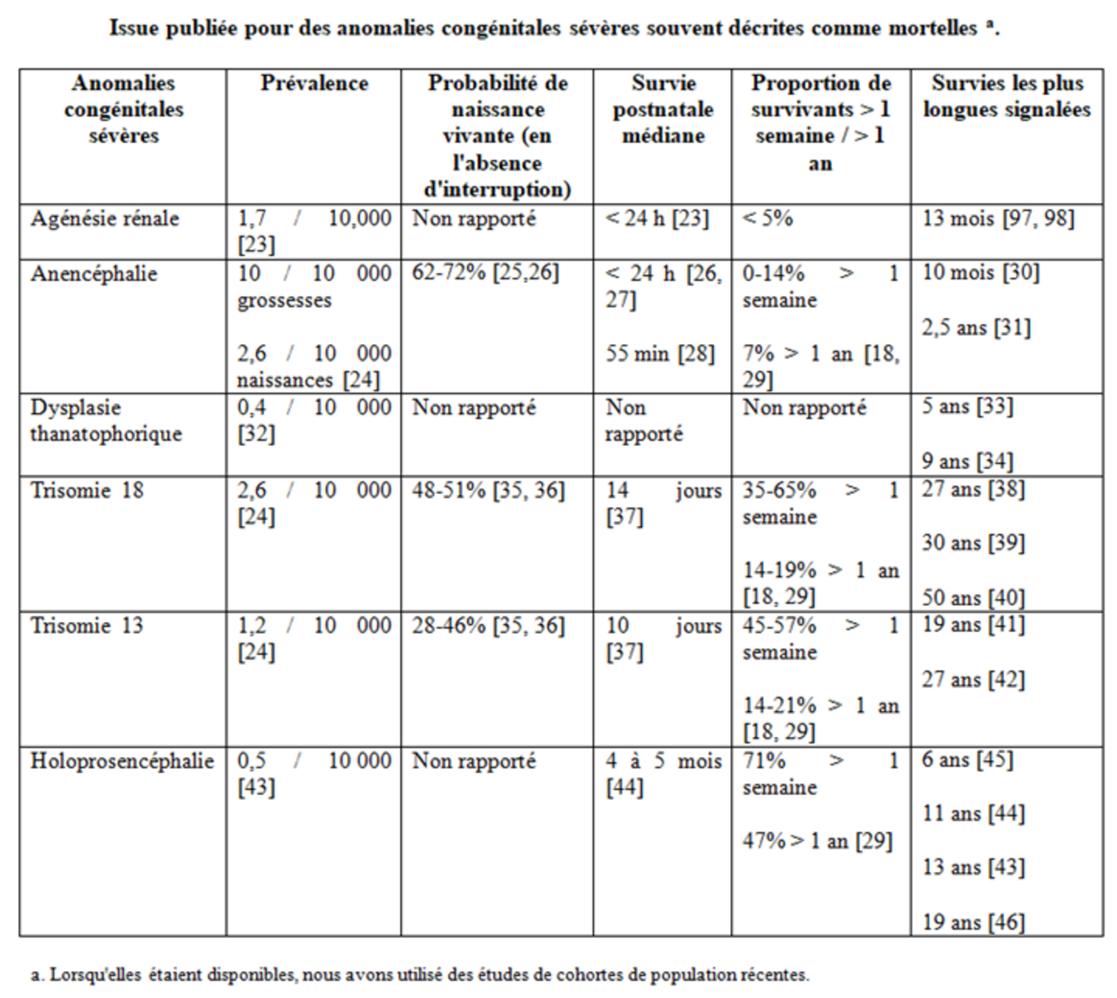 Cependant, il faut savoir que les médecins eux-mêmes divergent sur la définition des malformations létales : s'agit-il de celles qui ont plus de 50% de chances d'aboutir au décès prématuré de l'enfant? Ou faut-il plutôt parler de 75 %, 90%, 95% voire 99% de décès néonatals ? De même, il n'y a aucun consensus sur les pathologies qu'il faudrait y inclure, au point qu'aucune d'entre elles ne se retrouve sur toutes les listes. Enfin, même si la survie prolongée des nouveaux-nés atteints des malformations les plus souvent caractérisées comme mortelles est rare, elle est possible et attestée par plusieurs cas (allant de 10 mois à 2.5 ans de vie en ce qui concerne l'anencéphalie, et jusqu'à 50 ans pour la trisomie 18 ; et ces chiffres seraient plus favorables si l'écrasante majorité de ces grossesses n'était pas interrompue, souvent à cause d'informations inexactes voire déloyales).