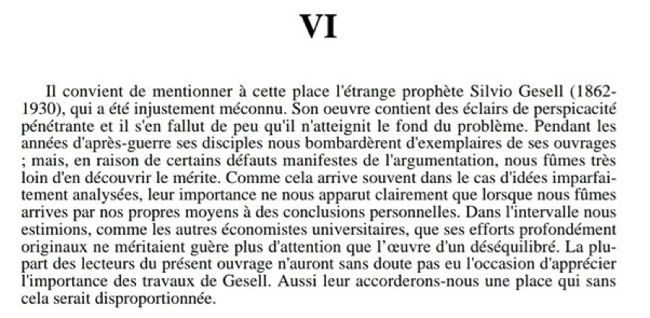 Keynes reconnaît que l'œuvre de Gesell "contient des éclairs de perspicacité pénétrante".