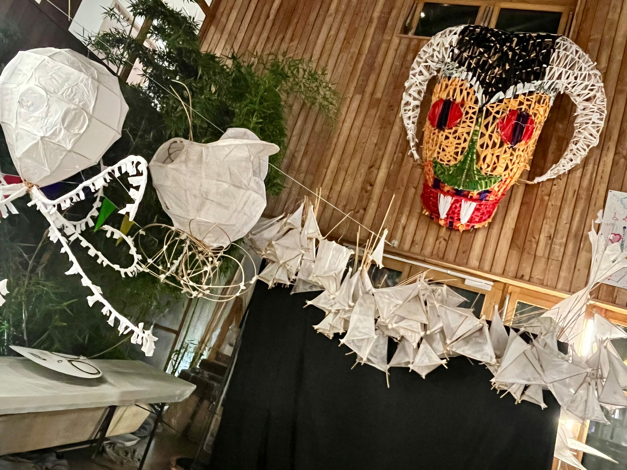 Cette fois-ci la déambulation sera parée de blanc. On voit en photo les premiers éléments fabriqués avec les enfants des deux écoles primaires d'à coté, l'école Micromégas et l'école Pablo Neruda. On y voit aussi quelques unes des décorations ainsi que deux des masques géants aux couleurs vives qui avaient été réalisés pour la déambulation de l'an passé.