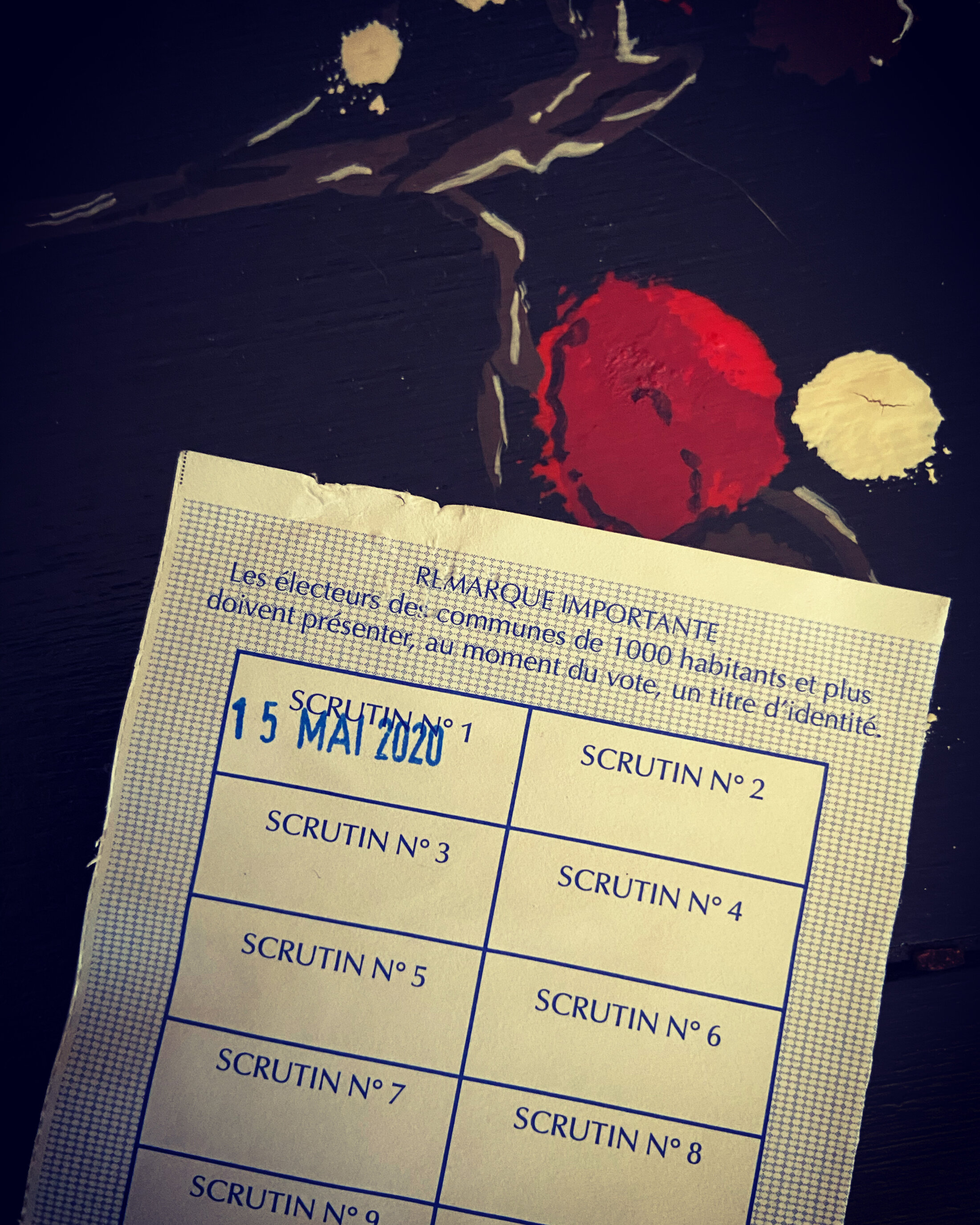 Aujourd’hui on vote sous haute surveillance, on se lave les mains dans les toilettes du bureau de vote avec la sensation d’être plus sale après qu’avant. Les isoloirs sont placés à l’envers afin que personne ne touche les rideaux. J’attend mon tour à 1m de la personne me précédant, je le sais grâce aux marques de scotch sur le sol, on se croirait un peu en prison.