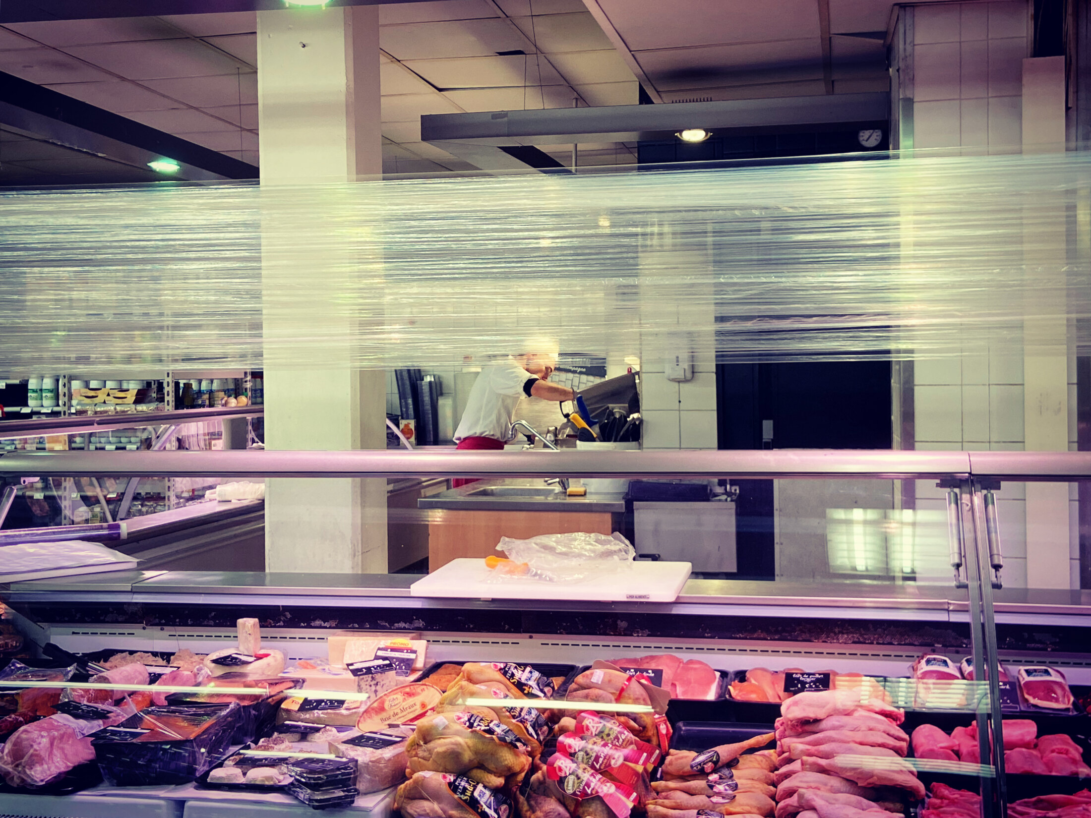 Devant le rayon boucherie entouré de film plastique, une vieille dame attend. Le boucher arrive, elle lui tend un paquet déballé qu’elle vient d’acheter. Elle lui demande s’il peut lui couper la viande car elle a oublié de demander et elle ne sait pas faire toute seule. Le boucher prend le paquet lui coupe la viande et la lui rend en la ré-emballant dans un sachet plastique.