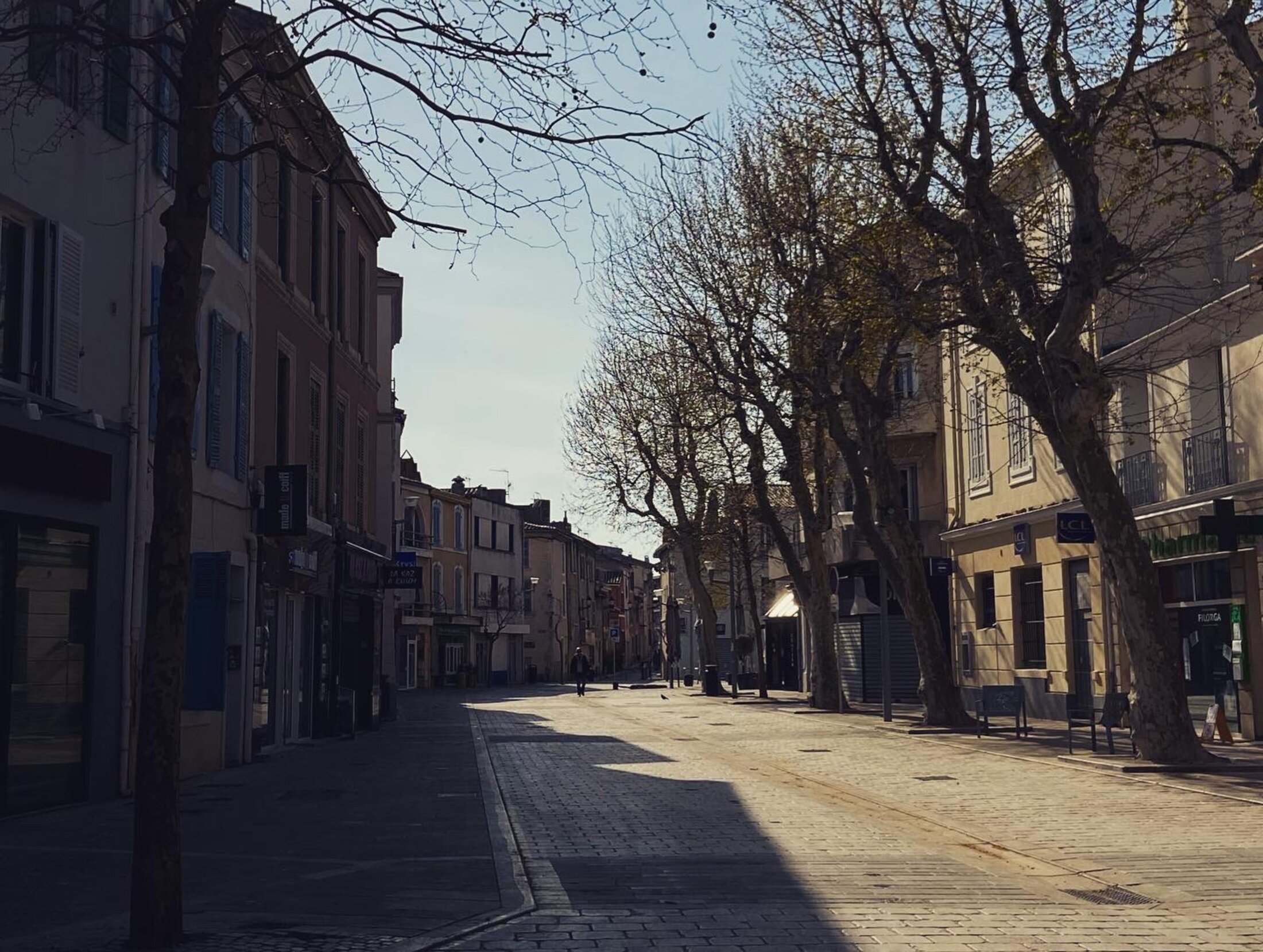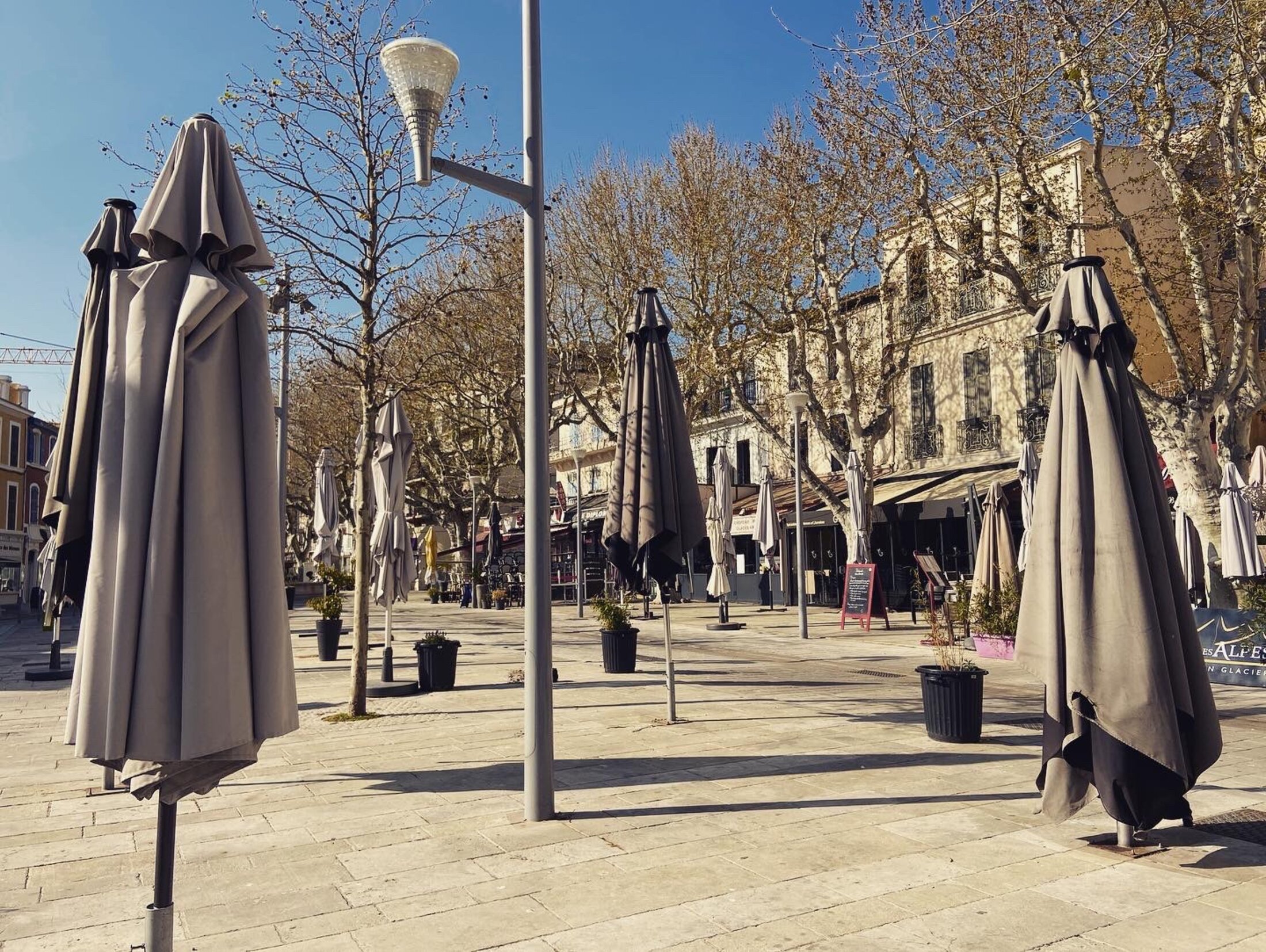 Il y a une semaine le gouvernement annonçait la fermeture des bars et des restaurants et ce jusqu’à nouvel ordre… Sur le Cours, les terrasses ont été rangées, il ne reste que les parasols et des poubelles qui servent de bac à fleurs.