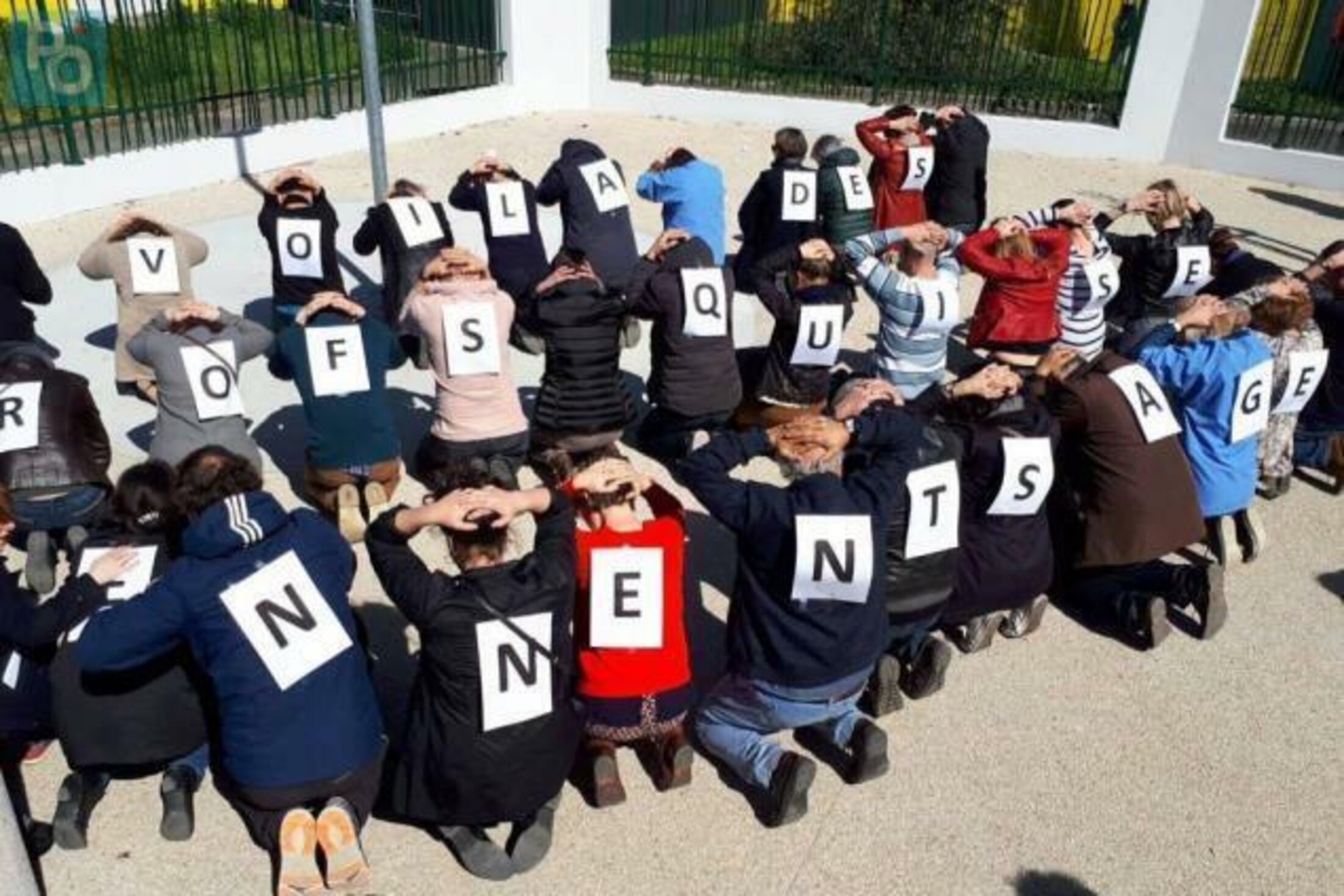 Par ailleurs, une forme nouvelle de censure se met en place. Dans la loi Blanquer, on voit en effet apparaître un «devoir d’exemplarité» qui n’a d'autre but que de museler les profs. Des chefs d’établissement refusent déjà de prêter des salles pour organiser des débats avec les parents d’élèves, comme ils ont refusé aux lycéens d’organiser des AG en décembre, au plus fort de la mobilisation des gilets jaunes. Les enseignant.e.s qui ont alerté le CHSCT sont convoqué.e.s par leur hiérarchie, le souci de la santé des personnels apparaissant désormais comme un potentiel problème. Episode récent du triste feuilleton, des profs du lycée Jean Perrin à Rezé ont mis en place une protestation sous la forme du 20/20 à tous les élèves afin de bloquer la plate-forme parcoursup. Résultat : ils ont été rappelés à l’ordre de façon particulièrement forte. Nos collègues du 44 ont protesté en publiant cette photo sur twitter... "Voilà des profs qui se tiennent sages" en écho au triste épisode des lycéens mis à genoux par les forces de l'ordre à Mantes-la-Jolie (78).