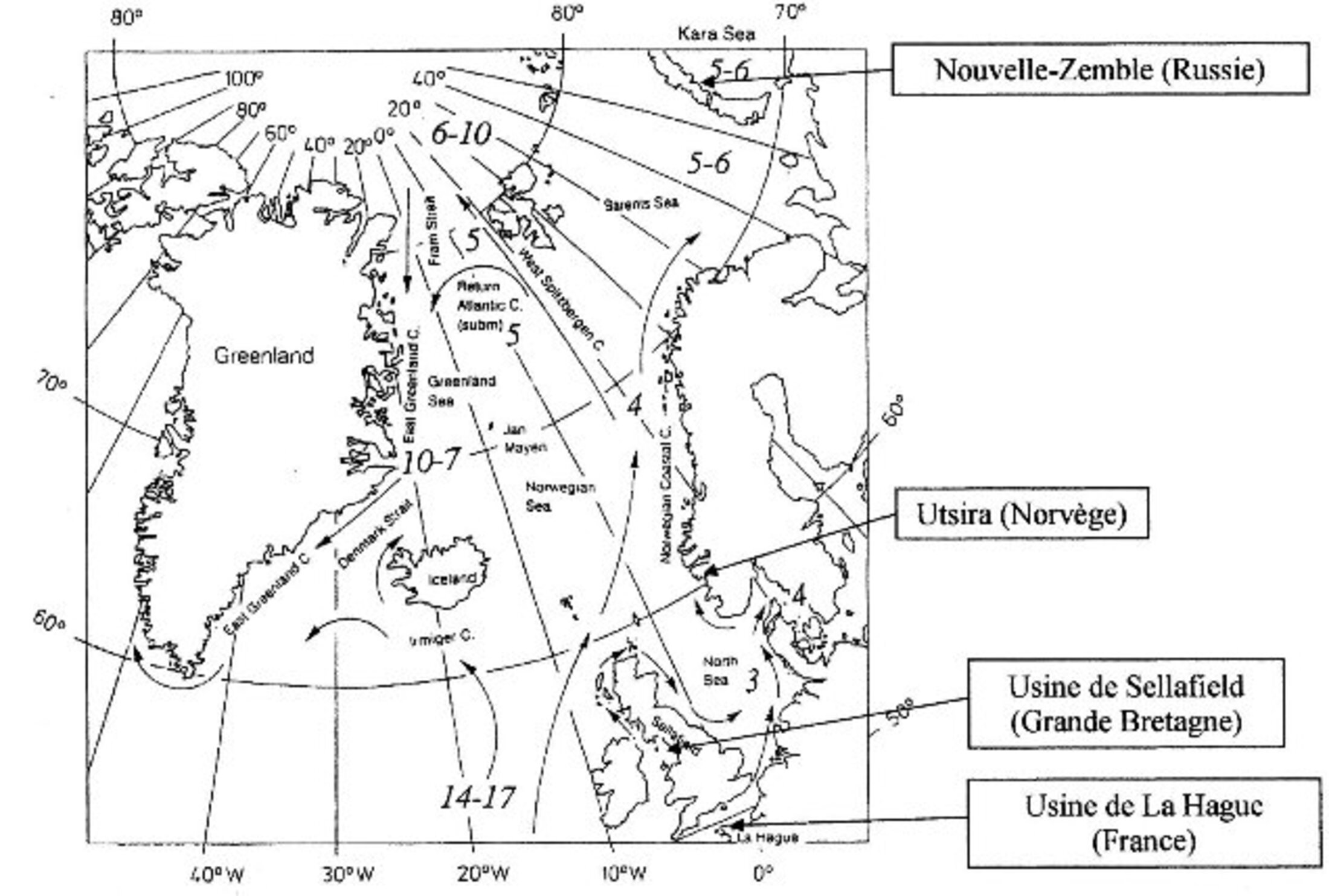 Fig. 11. Principaux Courants et temps en années pour le transfert d'une pollution déduits principalement d’événements de rejets radioactifs de Sellafield. Non indiqué, les quantités (facteurs de transferts) sont les plus importantes sur la côte norvégienne et la mer entre le Danemark et la Suède. Les rejets de La Hague et Sellafield se rejoignent vers l'Ouest du Danemark. Dahlgaard 1994 in Guéguéniat et al 1996, Edit. de physique.