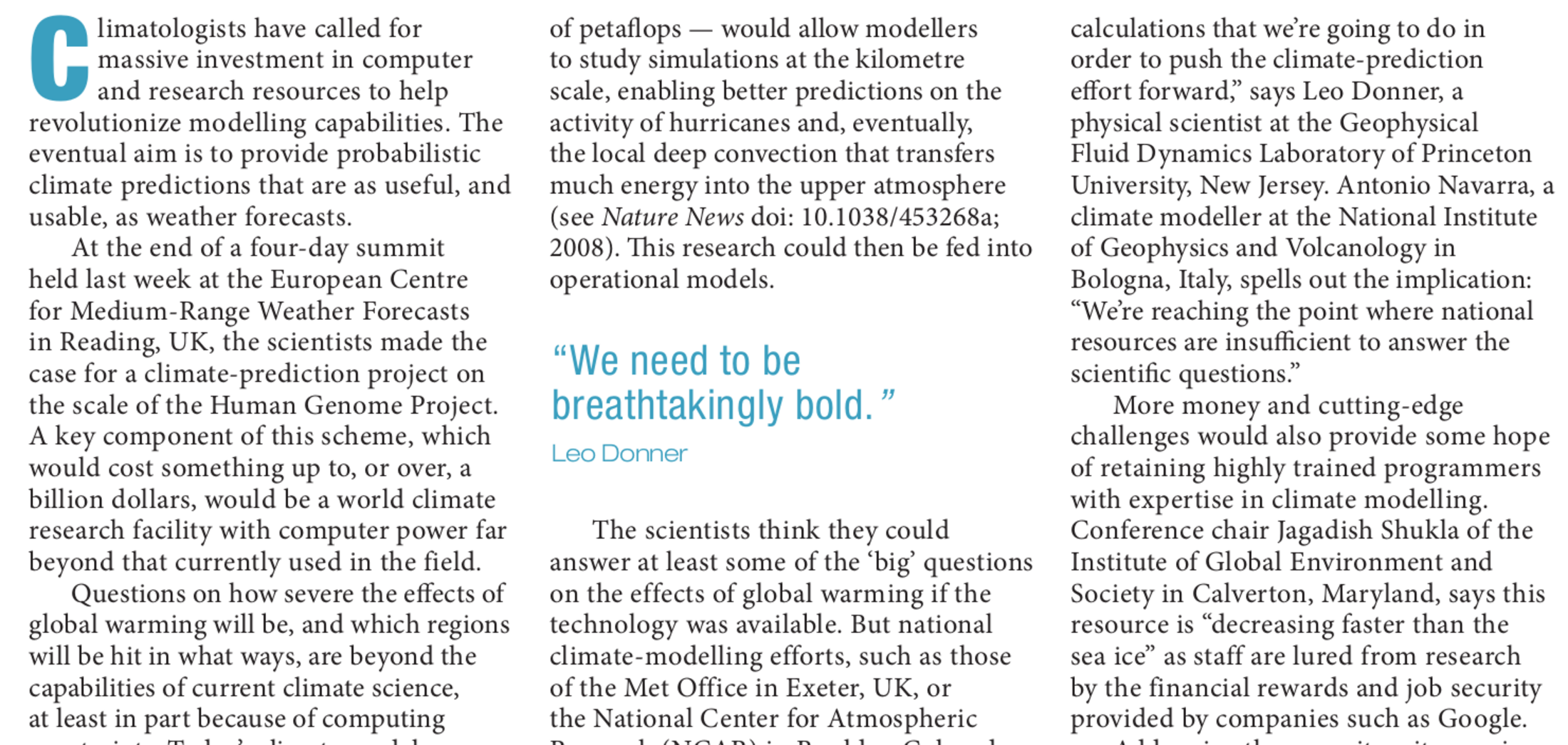 Le GIEC est un organisme onusien composé de représentants des États. C'est le lieu de lobbying de quasi exclusivement la modélisation et ceux qui en dépendent, les ramasseurs de données pour alimenter les bécanes. Celles-ci sont des ordinateurs pétaflops massivement parallèles, c'est à dire des ordinateurs géants que seuls les plus gros labos d'Etats possèdent. En 2008 la revue Nature (vol. 453, 15 May 2008, p. 268-9) rapporte que les « climate scientists » représentant ces gros labos réclament des gouvernements des « massive investment in computer » parce qu'ils se plaignent qu'on ne peut pas comprendre le climat(-numérique) comme actuellement avec des cellules(-numériques) plates de 100 km de coté. « Plus d'argent... donnerait aussi plus d'espoir de retenir les programmateurs de top-niveau avec de l'expertise en modélisation du climat... cette ressource « est en train de diminuer plus vite que la banquise » parce que ce personnel est détourné de la recherche par l'avantage financier et la sécurité du poste que leur donne des compagnies comme Google. ».Vue partielle :