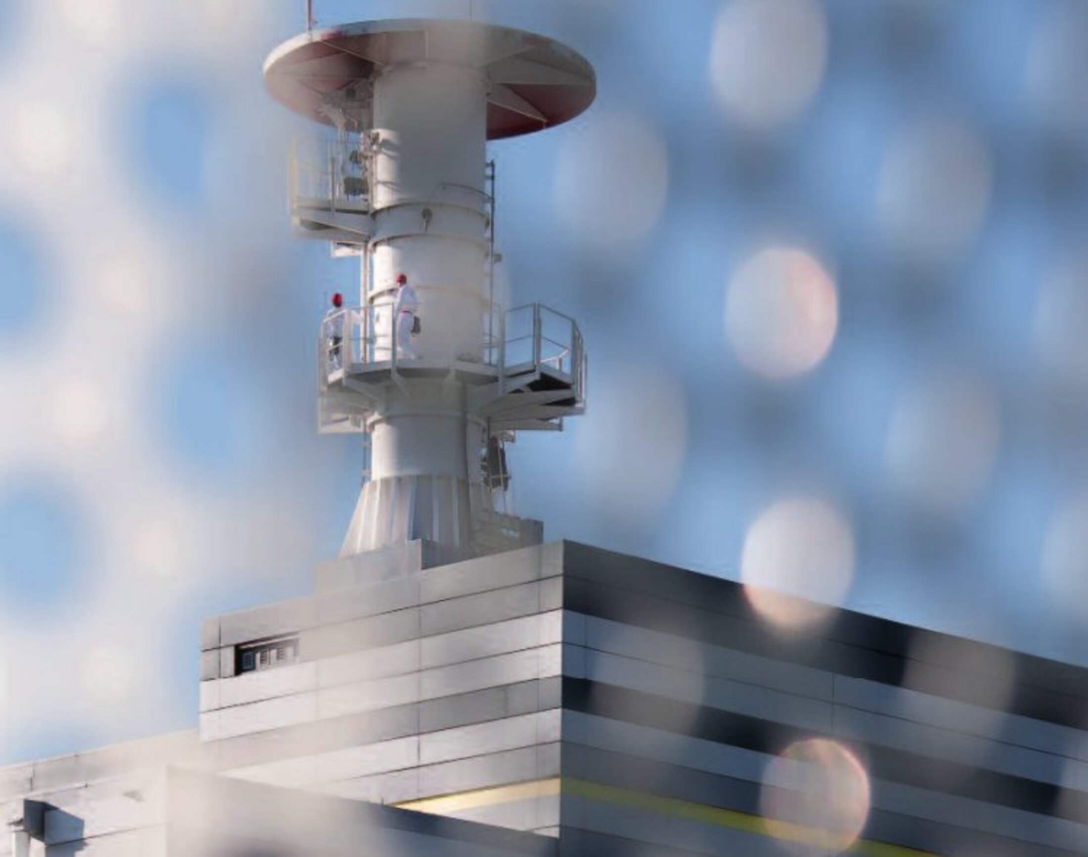 Fig. 2. Une des deux cheminées de MELOX à Marcoule. L'air tiré des ateliers de manipulation de poudre ultra fine d'Uranium et plutonium pour qu'ils soient en dépression, est expulsé à travers des filtres en cascade par ces cheminées