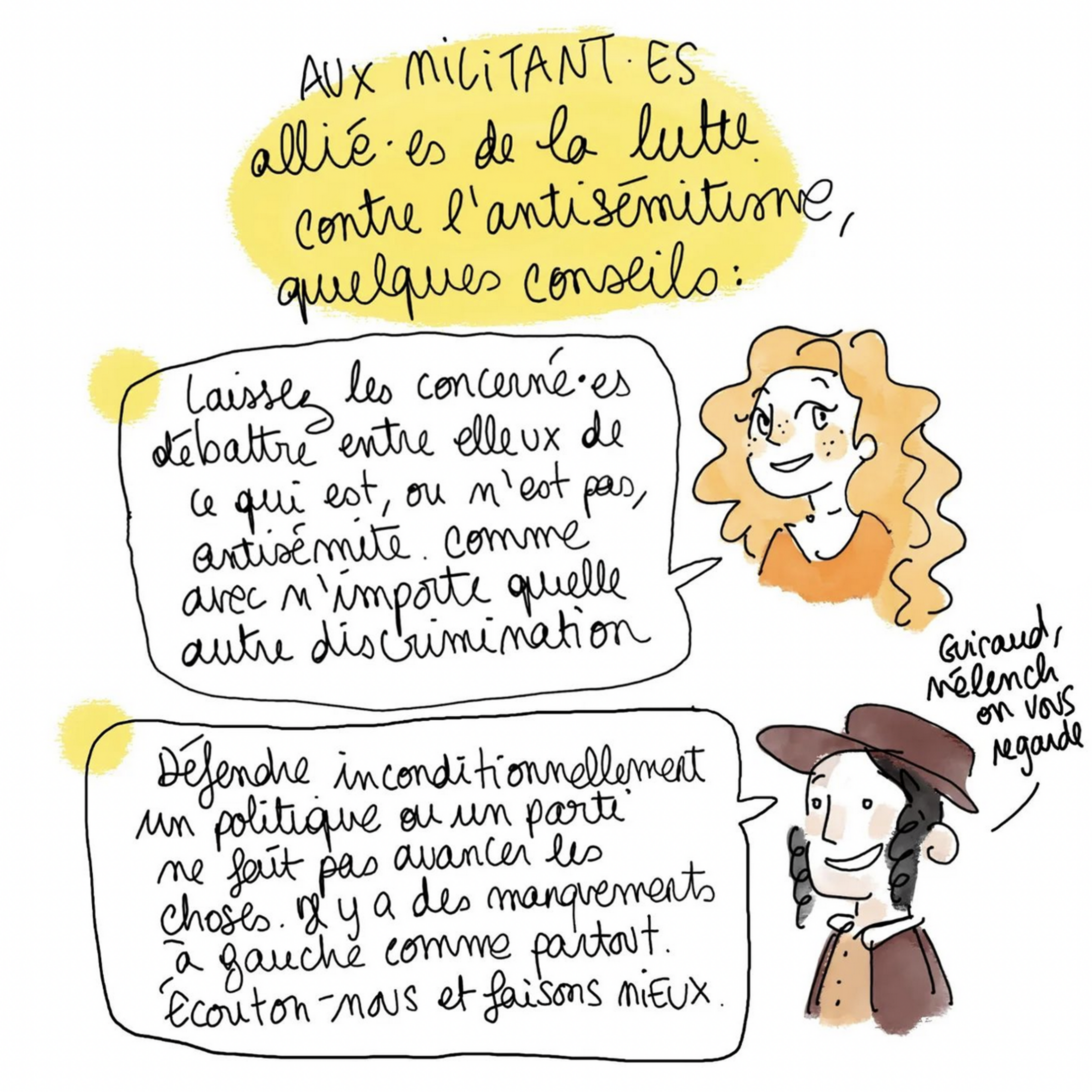 Cependant, une partie de la gauche, notamment de La France Insoumise, ignore l'antisémitisme de ses propres rangs et n'écoute plus les voix juives, que celles ci proviennent de la droite ou de la gauche. Iels rejettent ces accusations en affirmant qu'il s'agit de tentatives de discréditer leur parti et de bloquer toute critique d'Israël, perdant ainsi toute capacité d'écoute envers les juifves français·es, refusant systématiquement de se remettre en question.