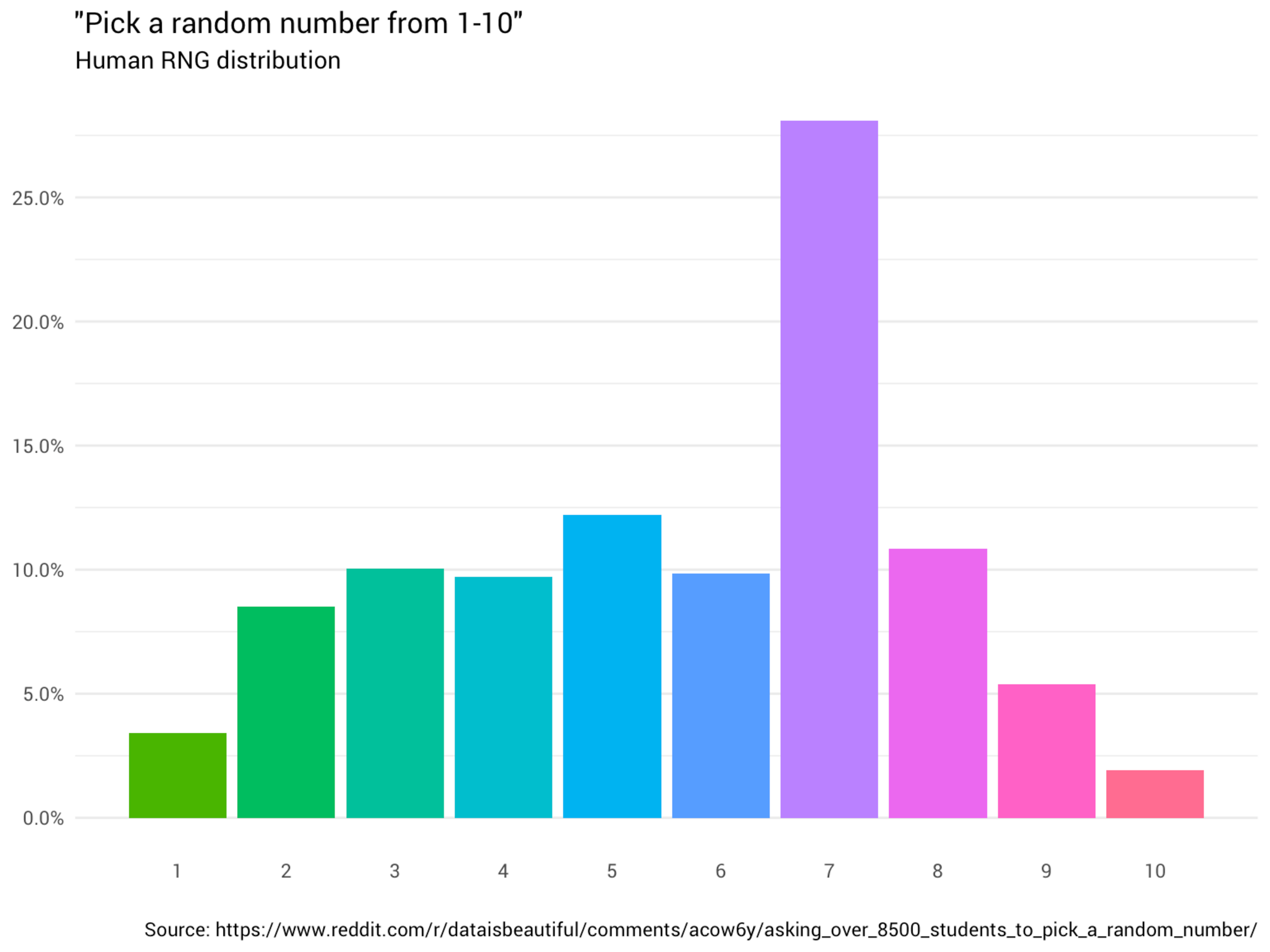 Par exemple, si vous demandez à des personnes de générer aléatoirement des nombres uniformément entre 1 et 10, vous constaterez que la distribution des nombres générés n'est pas vraiment aléatoire. Le chiffre "7" est souvent disproportionnellement choisi dans de tels exercices.En comparaison, une machine peut générer une distribution de nombres pseudo-aléatoires avec des distributions beaucoup plus ressemblantes à un aléatoire abstrait (même probabilité pour chaque nombre)