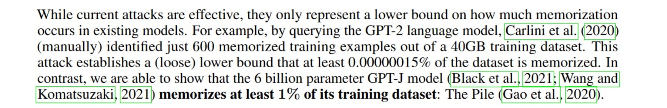 Les modèles de langage récents mémorisent en partie leurs données d'entraînement, des recherches ont documenté jusqu'à 1% de la base de données d'apprentissage, sans écarter la possibilité que la fraction mémorisée soit plus importante.