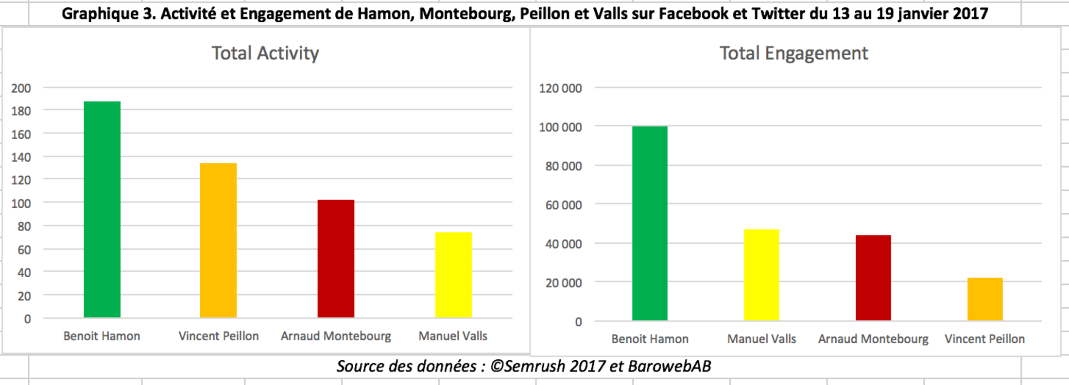 Sur les réseaux sociaux, l’intérêt relatif pour B. Hamon par rapport à celui pour les autres candidats est encore plus net. L’impact de la communication de B. Hamon avoisine les 100 000 interactions au cours des sept jours écoulés, alors que les données d’engagement de M. Valls et d’A. Montebourg sont inférieures à 50 000.