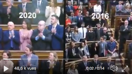 En 2016 Iglesias et ses camarades parlementaires avaient refusé d'applaudir le Roi après qu'il eut fini son discours au Congrès. Aujourd'hui, virage à 180°, ils l'ont applaudi (cliquer ici). Il est vrai qu'Iglesias et quelques autres siègent désormais sur le banc du gouvernement. Podemos (et IU dans la foulée) est devenu un parti du régime, c'est ce que ces applaudissements consacrent !