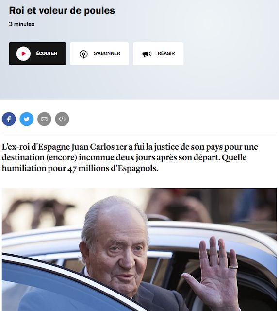 Ah oui, Pablo Iglesias joue à l'effarouché : il s'agite, tonitrue, se scandalise de ladite fuite mais pas de son acceptation...active (1) dans l'opération (ni de l'éloge concomitant du régime, né en 1978 sous l'égide du fuyard couronné, dont la dénonciation était il n'y a pas longtemps au coeur des discours de Podemos) par Pedro Sánchez... au nom du Gouvernement, donc de Pablo Iglesias ! Il n'y a pas que la monarchie et l'idée de démocratie ou de justice (2) qui vacillent en Espagne. Pauvre gauche, misérable gauche... Oui décidément quelle humiliation pour un peuple espagnol toujours dépossédé du pouvoir d'opter pour la république !