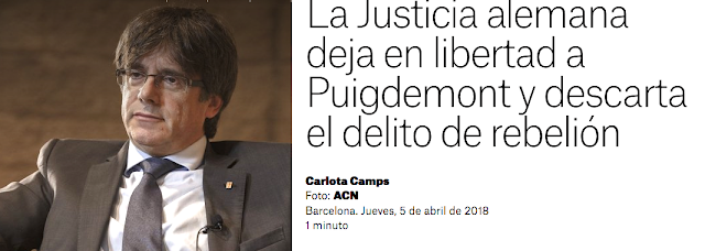 La levée de bouclier qui commence à se dessiner dans l'opinion publique et le personnel politique allemands, au vu du sort qui est infligé à Puigdemont mais aussi aux prisonniers politiques catalans, contre la nature liberticide du gouvernement espagnol, montre que l'internationalisation de la question catalane marque des points. Premier acte réussi : la libération aujourd'hui du persécuté catalan ! Mais rendons hommage à la remobilisation de la société catalane, à tous les niveaux (relayée par les collectifs de solidarité internationaux dont ce blog s'honore de faire partie), y compris dans la rue, y compris par les actions de blocage des routes et des autoroutes, depuis l'arrestation de Carles Puigdemont. Soyons sûrs que cette remobilisation a largement pesé pour créer le "climat" rendant difficile un simple jeu des rouages judiciaires et politiques...