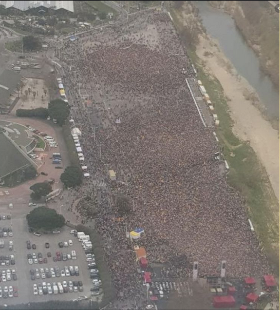 Le bouclage précoce de l’enceinte du Parc des Expositions par mesure de sécurité devant l’afflux des participants, avec des milliers de personnes, esteladas au vent comme à l’intérieur, se massant tout autour, est l’expression la plus exacte et émouvante d’un tranquille débordement populaire ayant surpris les organisateurs et jusqu’aux espagnolistes les plus endurcis. Témoin, Santiago Abascal, le grand chef des néofascistes de Vox, reconnaissant, accablé, dans un tweet crépusculaire, « Soyons réalistes, ils sont en train de gagner » avant de se ressaisir in extremis mais façon Coué guerrier « Soyons fermes, ils ne vaincront jamais » (lire ici en espagnol) !