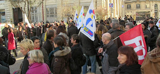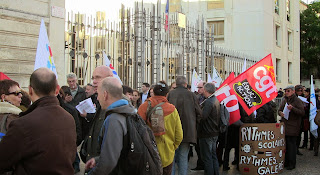 Les conversations par grappes, par groupes se font comme à mi-voix pendant que l'on attend le retour de la délégation syndicale qu'unmembre du cabinet du préfet veut bien recevoir... Routine des manifs qui n'en sont pas vraiment et en restent au rassemblement devant des grilles qui donnent bien le ton du moment : ça ne passe pas... Peillon aurait-il donc gagné la partie ? N'y aurait-il plus qu'à repartir chacun dans sa classe à reprendre goût à ce qui, au final, fait le sel de ce métier : le rapport aux enfants, à leurs parents, la volonté de faire reculer les mécanismes de ségrégation sociale que l'école voudrait tant neutraliser sans en avoir les moyens... Eh bien, justement, trop facile, ça ne marche pas : trop c'est trop... Retrouver, par-dessus le bonheur d'être toujours "l'instit", parfois aussi via le stress de ne pas y arriver comme l'idéal chevillé au corps l'exige toujours, la colère de savoir que c'est la gauche qui nous fait ça... non, il faut continuer. Autant conserver quelque chose de ce pour quoi on a fait le déplacement devant ces foutues grilles qu'une banderole s'ingénie à signifier sur le mode revendicatif : suspension de la réforme, abrogation du décret...