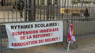 Elles/ils étaient peut-être 200, plus ? moins ? à se masser devant les grilles de la préfecture pour manifester, pour la deuxième fois en quelques jours, leur opposition à la réforme des rythmes scolaires imposée par le ministre Peillon.