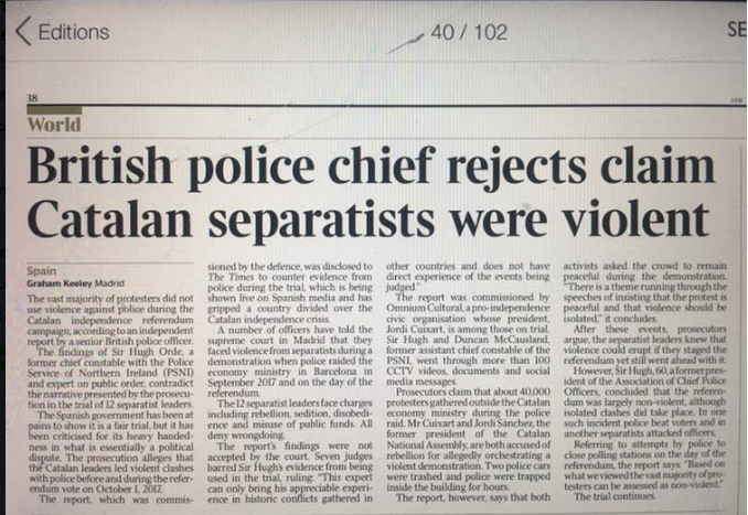Les rédacteurs de l'article de eldiario.es précisent que les deux rapporteurs anglais ont une expérience, sur 30 ans de métier, de ce qui touche aux opérations de maintien de l'ordre public et de lutte antterroriste. Ils ont rédigé ce rapport d'expertise, auquel eldiario.es mais aussi le Times ont eu accès, à la demande des avocats de Jordi Cuixart mais il n'a pas été déclaré recevable par le Tribunal Suprême qui juge les responsables catalanistes.