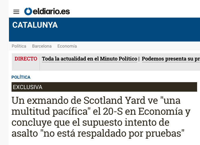 Billet écrit à partir de EXCLUSIVA Un exmando de Scotland Yard ve "una multitud pacífica" el 20-S en Economía y concluye que el supuesto intento de asalto "no está respaldado por pruebas"