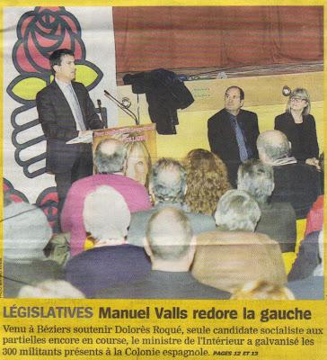 La journaliste qui titre ainsi son papier nous avoue tout de même que l'exploit doré de Valls n'a concerné que les militants socialistes venus l'accueillir. Car, question électeurs, il en aurait fallu plus et surtout autrement pour espérer commencer (ne rêvons pas) à rendre crédible un discours de gauche en cette ville si dévastée par une paupérisation galopante dont pourtant la droite porte largement la responsabilité. Avec Valls c'est en effet tout l'opportunisme de droite de la gauche gouvernementale qui vient chercher à se gagner des voix de l'extrême droite biterroise : Valls, l'expulseur de Roms, la terreur des délinquants, le promoteur des sécuritaires ZSP dont deux ciblent les quartiers populaires de la ville (La Devèze et Les Arènes); Valls en soutien de la candidate du PS signifie, dans un implacable retour de balancier, se priver des voix de gauche et/ou des quartiers populaires qu'insupportent ces sorties néosarkozyennes, adoubées par tout le gouvernement. Mais Valls c'est plus que sa misérable personne politique et son minable ministériat : c'est l'emblème de tout un gouvernement et d'une présidence qui s'inscrivent dans la programmation d'une sortie de crise du capitalisme au frais de la population. La défaite de l'idée même de gauche est ainsi scellée à Béziers : que ce soit par un improbable retournement du rapport de forces qui verrait une candidate parrainée par le plus caricatural des politiciens de la gauche de droite l'emporter ou que ce soit par une défaite qui amènerait la droite extrême à s'imposer.