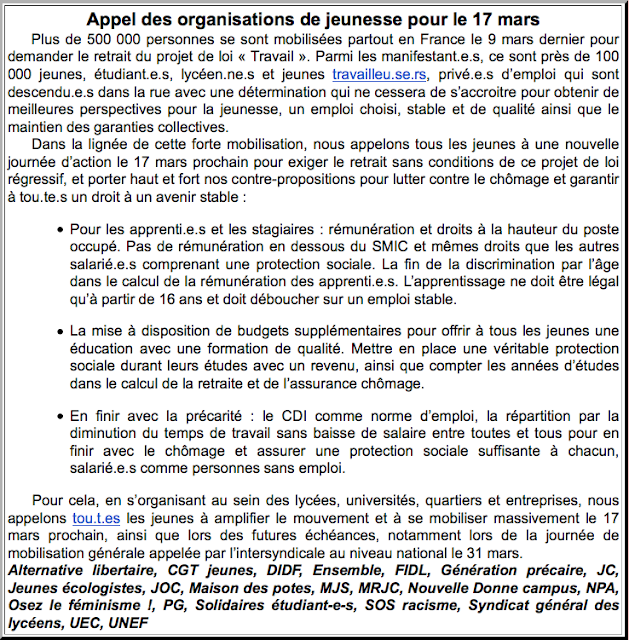 Les organisations de jeunes sont la pointe avancée du mouvement contre la Loi Travail. Leur détermination, vivifiée par l'unité qu'elles ont su construire, est décisive pour faire basculer les facs et les lycées dans la lutte. Mais, comme cela est apparu le 9, avec le premier succès de mobilisation qui a obligé le gouvernement à rétropédaler momentanément, la dynamique que ces organisations ont enclenchée joue au-delà de la jeunesse : elle a souvent pris appui sur la mobilisation des cheminot-es, a été relayée par les principales confédérations ouvrières et a mobilisé nombre de salarié-es. Des regroupements, comme à Montpellier, de type AG de villes contre la Loi Travail se sont également constitués et jouent aussi un rôle de catalyseur de l'action. L'enjeu est que ces jonctions fassent tache d'huile, se consolident et construisent dans la durée un mouvement qui se donne les moyens d'aller jusqu'au bout dans la constitution du rapport de force permettant d'infliger une défaite sans appel à ce gouvernement des patrons ! L'appel à manifester et à faire grève le jeudi 17 (avec en perspective l'action intersyndicale du 31 mars) lancé par ces organisations de jeunesse avec le soutien renouvelé des syndicats de salarié-es et des AG de villes est à la hauteur de cet enjeu et doit être largement relayé par la diffusion de l'appel pour le 17 que nous reproduisons ci-dessous :