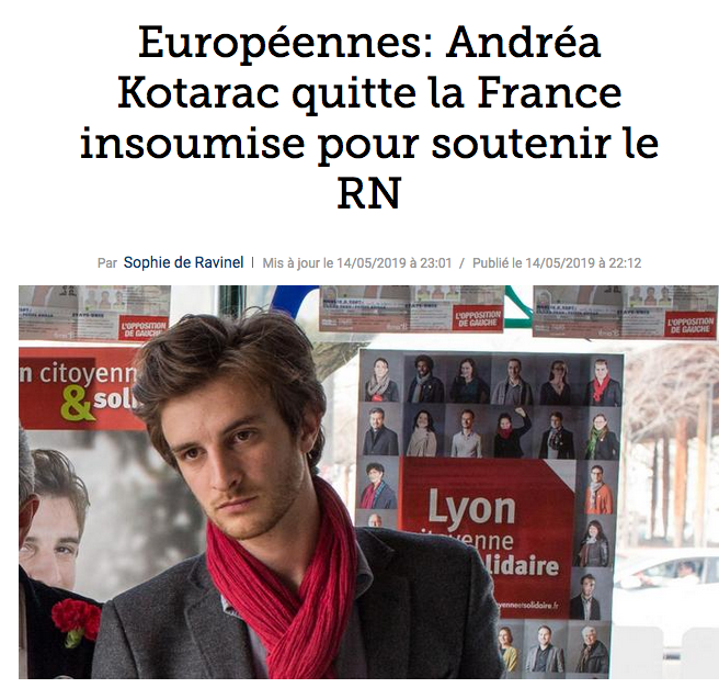 Mais il ne faut pas oublier que pendant ce temps Mélenchon poursuit l'envoi de signaux d'ouverture vers ceux qu'il vilipendait il y a peu et qui ont ouvert la voie au FN/RN (et à Macron). Vous vous souvenez : à propos des socialistes et même des communistes, « le retour de la tambouille, jamais! » (septembre 2017) ? Aujourd'hui le même Mélenchon est sur la ligne en direction des socialistes: «Que finisse cette longue solitude pour moi d’avoir été séparé de ma famille» (septembre 2018) ... Ma famille, ça ne s'invente pas. Alors ça invoque un "Front populaire nouvelle manière" (toujours 2018) et aujourd'hui une "fédération populaire" (Libé, avril 2019), pour nous faire accepter que le PS pourrait (ce sera dur mais plus impossible...ça dépend d'eux !) échapper au syndrome de la tambouille ! Et Maurel et Lienemann sont déjà là au chaud dans la mélenchonie.