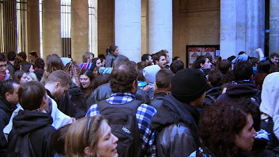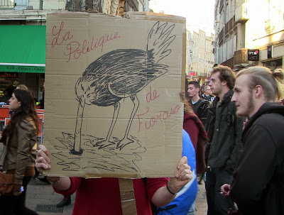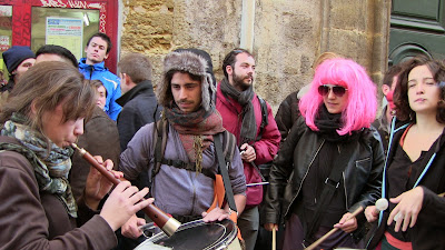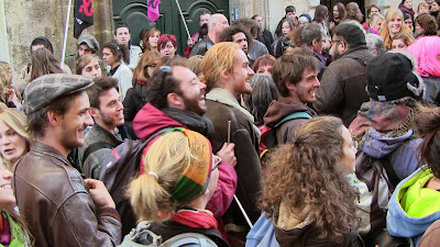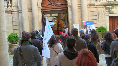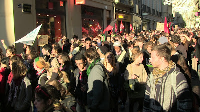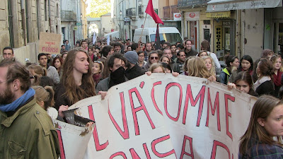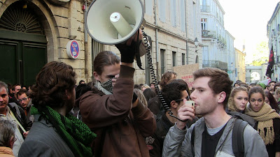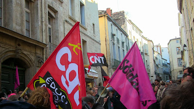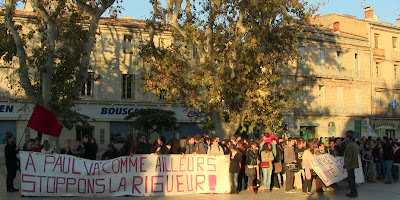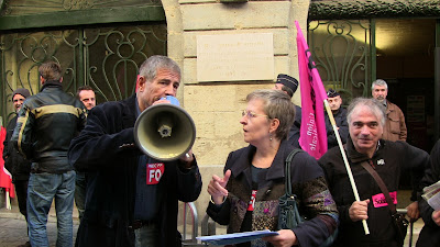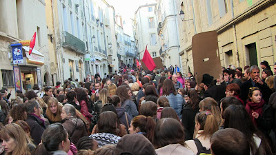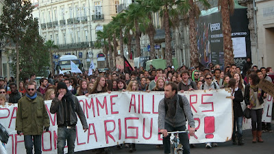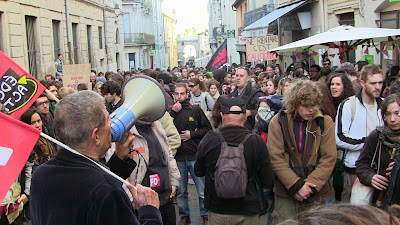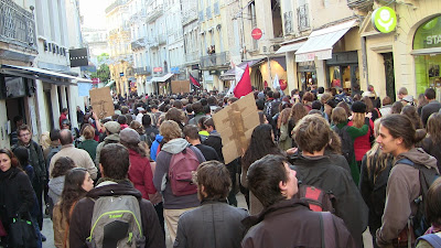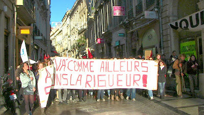 Comme annoncé, environ 400 étudiants de Paul Valéry ont fait le déplacement pour se joindre quelques instants aux enseignants mobilisés. En lutte depuis plusieurs semaines pour imposer la récupération de dotation budgétaire nécessaire au maintien en l'état d'une situation par ailleurs peu satisfaisante mais aussi pour obtenir le retrait de la réforme Fioraso LRU 2, ils ont à nouveau montré leur détermination et leur volonté de faire la convergence avec les autres luttes. Après des adresses au mégaphone des étudiants aux enseignants et vice-versa, les premiers ont poursuivi leur manifestation dans le centre de Montpellier jusqu'au Plan Cabanne. Des équipes volantes sont ensuite parties distribuer des tracts devant les lycées pour élargir l'action en ce jour où par ailleurs des mobilisations ont eu lieu dans diverses autres universités. Retenons qu'aujourd'hui des actes forts ont été posés pour que, dans l'éducation, des luttes s'engagent, s'élargissent et dessinent en filigrane des possibilités de convergences contre une politique gouvernementale qui a totalement perdu le sens du service public, de l'intérêt des salariés comme des enfants et des usagers... Voilà par où la crise de la lamentable gauche de gouvernement pourrait se résoudre contre une droite et une extrême droite à l'affût mais incapable de "suivre" ou même d'être à l'initiative d'une contestation des politiques libérales que, sur le fond, elles partagent !