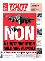 [...] Ancienne puissance coloniale, la France investit massivement le Mali : chasseurs bombardiers, hélicoptères, véhicules blindés, troupes spéciales et services de renseignements et, dans les jours qui viennent, une force de 2 500 hommes qui seront déployés sur le terrain et engagés dans les combats. Contrairement aux déclarations de campagne de François Hollande, la France fait le « gendarme en Afrique » et bien plus encore. [...]