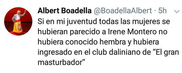 Irene Montero est une dirigeante de Podemos, par ailleurs compagne de Pablo Iglesias et aucunement catalaniste. Il y a dans ce texte tout le masculinisme méprisant envers les femmes, qui ne voit en elles que l'objet sexuel pouvant satisfaire les pulsions du mec. Irene Montero femme politique, n'est pas, pour ce bouffon abject, une femme politique. Il y a une volonté de la rabaisser comme non baisable (avec d'autres de cet acabit c'est, au contraire, parce qu'elles sont baisables ! Il n'y a pas d'échappatoire pour les femmes face à de tels individus...) et antimodèle du féminin que les machos réacs trimballent. Pitoyable ce grand pourfendeur de l'indépendantisme catalan lequel, entre autres vertus est, toutes tendances confondues, un défenseur de l'égalité entre hommes et femmes et radicalement pourchasseur de ce que ce vulgaire machiste (pardon pour la redondance) éructe : l'idée que faire de la politique, circonstance aggravante, faire de la politique de gauche, détruirait la féminité, laquelle politique devrait être réservée aux mecs ! Belle leçon de choses que l'espagnolisme nous soit présenté à travers "ça".