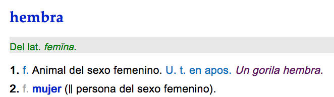 Les choses, quand il s'agit des femmes spécialement, n'étant jamais acquises, le dictionnaire espagnol de référence, le DRAE, Diccionario de la Real Academia Española, donne toujours ceci à l'entrée "Hembra :