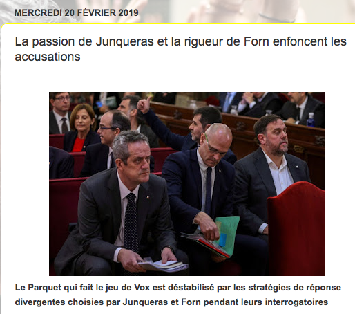 Le Parquet qui fait le jeu de Vox [l'accusation portée par l'extrême droite] est déstabilisé par les stratégies de réponse divergentes choisies par Junqueras vice-président de la Généralité lors du référendum du 1er octobre 2017] et Forn [au même moment, conseller, soit ministre, de l'Intérieur de la Généralité] pendant leurs interrogatoires