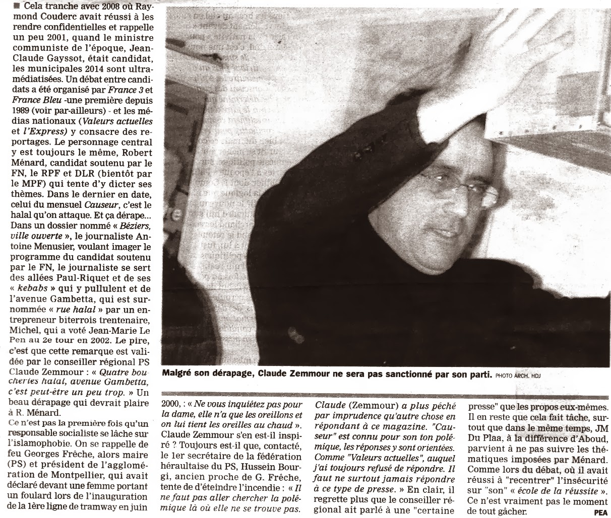 La conclusion ? C'est du côté d'Hussein Bourgi qu'il faut aller la tirer : on a connu le secrétaire départemental du PS, confronté à l'affaire Zemmour, beaucoup plus "radical" sur les discriminations, concernant plus précisément les LGBTI. D'où la question à lui adressée : le musulman/la musulmane ne méritent-ils pas, autant que les gays, les lesbiennes, les trans, etc., de bénéficier de la défense solidaire contre la vindicte des stigmatiseurs patentés qu'ils soient de la droite extrême ou de l'extrême droite mais aussi de celle qui sait s'afficher, tel ce Zemmour, comme une extrême "gauche de droite"... dans son propre parti ? Mais il est vrai qu' à l'école de Georges Frêche, le socialisme local a toujours eu une longueur d'avance dans la mise à mort des idéaux de gauche, comme le rappelle fort à propos L'Hérault du jour.