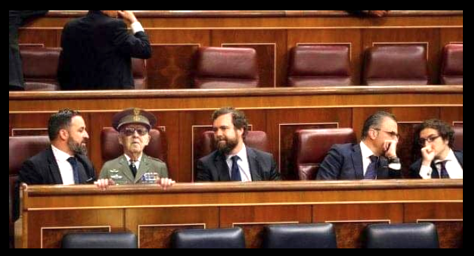 Moment inouï, capté lors de cette session parlementaire, où le chef de Vox, à gauche, a réussi à introduire dans l'hémicycle, son mentor en uniforme d'apparat.
