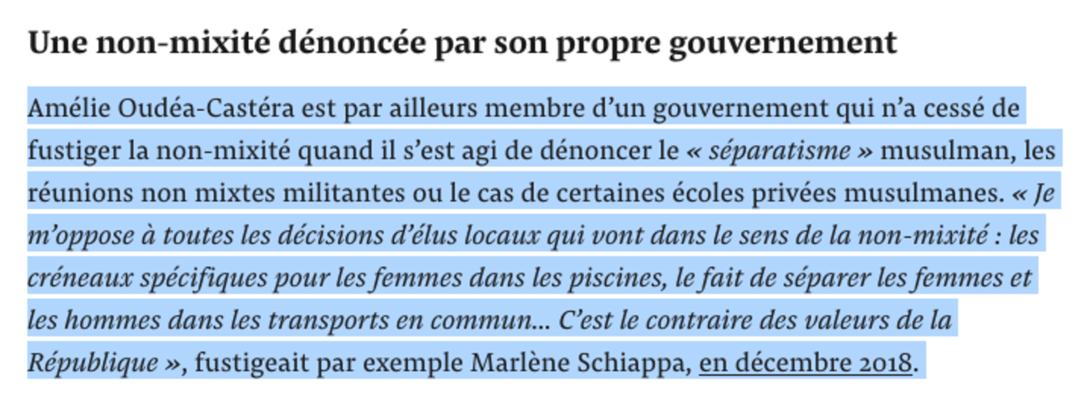 En effet, ces affaires créées de toutes pièces (et cela depuis le début en 1989) et régulièrement montées en épingle contre des élèves mises à l'index pour afficher des signes de musulmanité (alors que c'est infiniment plus complexe), se sont toujours inscrites dans des campagnes identitaristes républicanistes antimusulman.e.s prétendant traquer les marques de séparatisme que porteraient ces signes vestimentaires mais aussi des manifestations sociales comme des ateliers "décoloniaux" non-mixtes. Séparatisme en effet intrinsèquement lié à la revendication d'une non-mixité dont, pour revenir à l'école, les jeunes filles seraient victimes et qui "obligerait" les chevaliers... blancs (tiens donc !) à les libérer en les (ré)intégrant dans ce que la bonne école républicaine incarnerait par essence (en "oubliant" qu'elle a très longtemps été non-mixte ?) : la mixité synonyme d'égalité entre garçons et filles dont dépend qu'elle s'inscrive entre femmes et hommes .